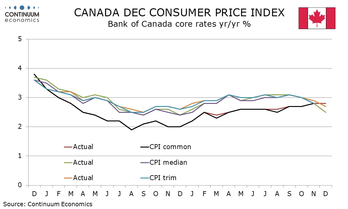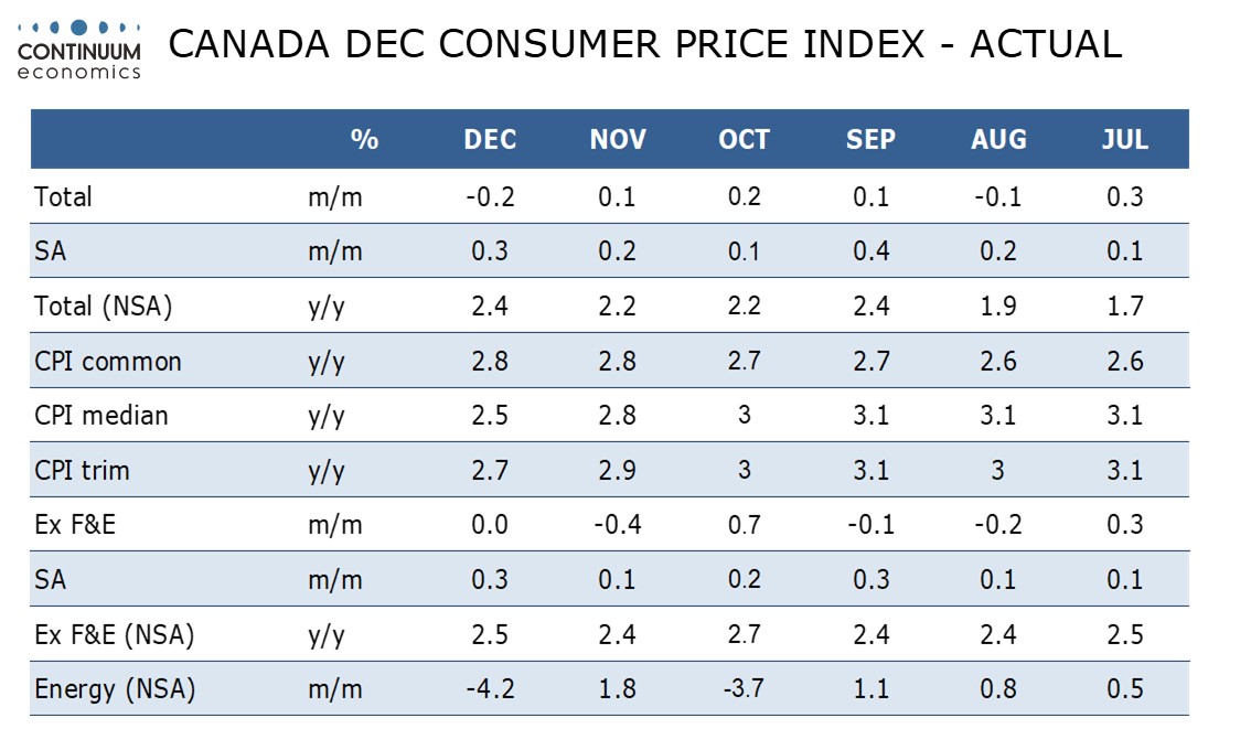 December Canadian CPI at 2.4% yr/yr has accelerated from 2.2% in November but the BoC’s core rates are softer. The contrast is explained by a year ago tax holiday inflating the overall figure but not the core rates, which will matter more to the BoC. Still, easing at next week’s BoC meeting remains unlikely.