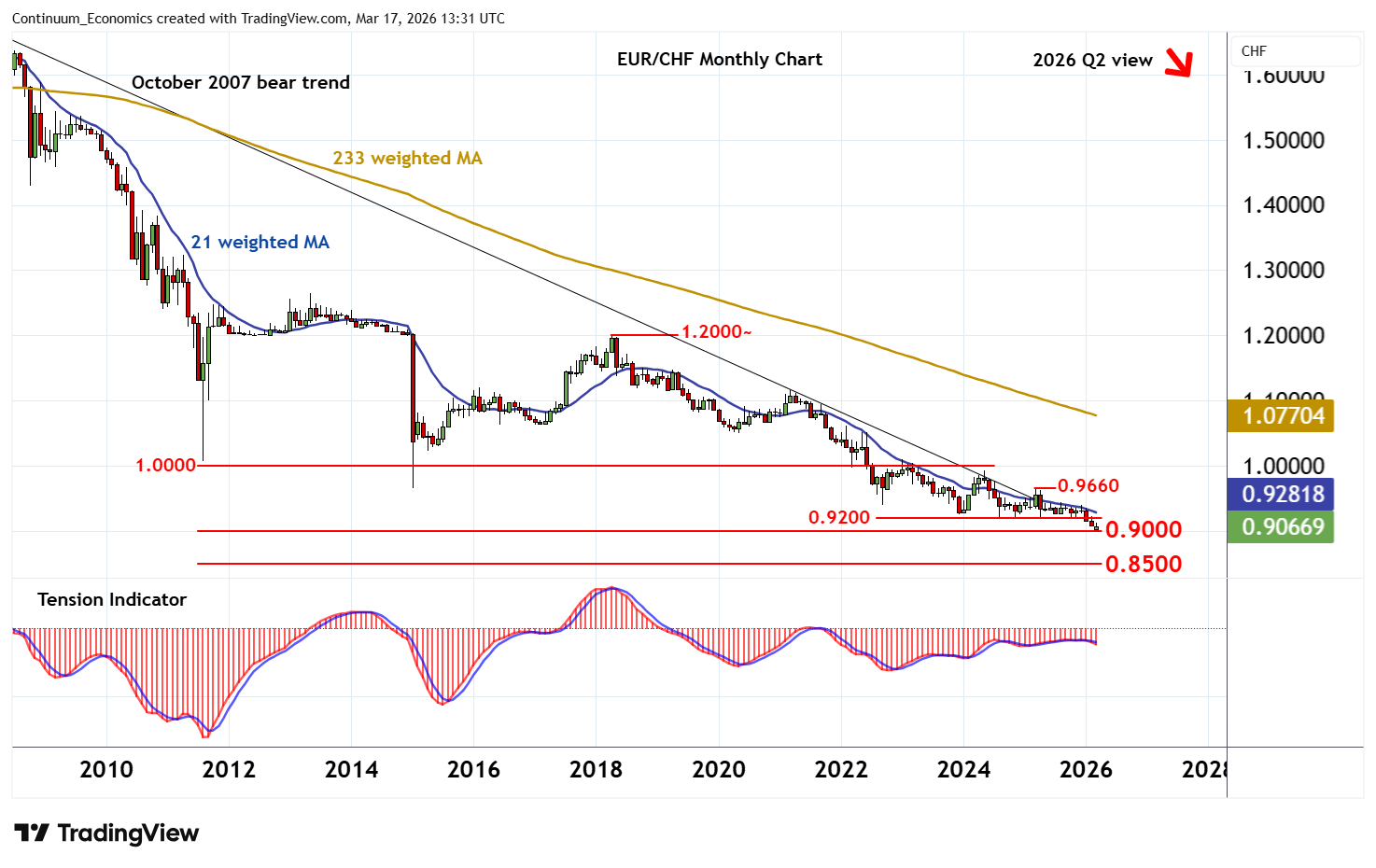 A close below 0.9000 will add weight to sentiment and extend long-term bear trends towards psychological support at 0.8500.