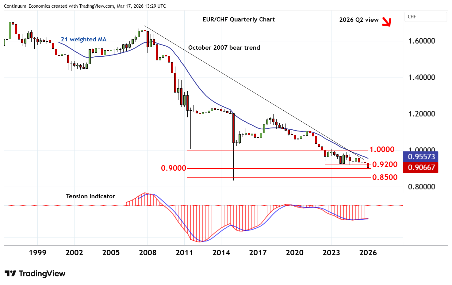 Chartbook: Chart EUR/CHF: Potential for a minor bounce from fresh lows, before long-term bear trends resume