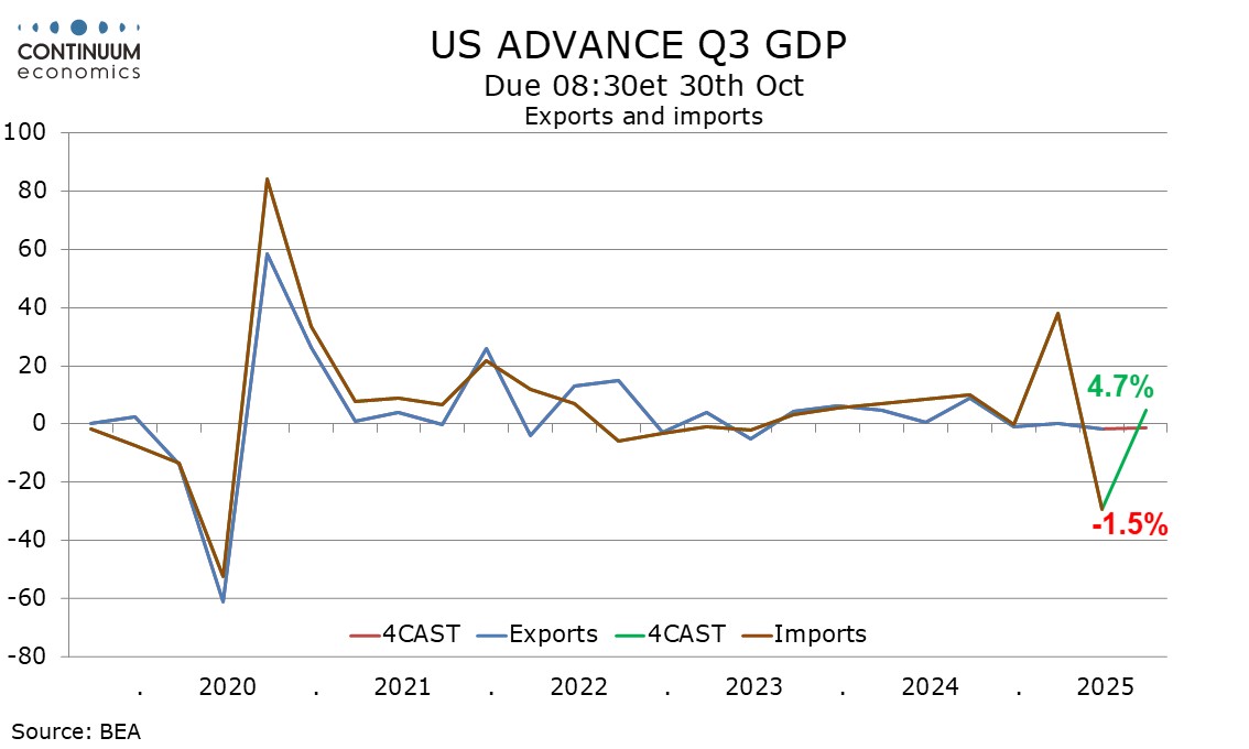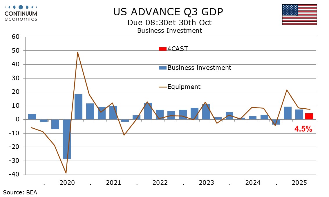 We expect a negative contribution of 0.6% from net exports, even when assuming a September trade deficit closer to August’s narrower deficit than July’s wider one. August’s deficit in real terms was still wider than the Q2 average, which fell sharply after a pre-tariff surge in Q1. In Q3 we expect a 1.5% decline in exports and a 4.7% rise in imports, the latter supported by reduced tensions with China.