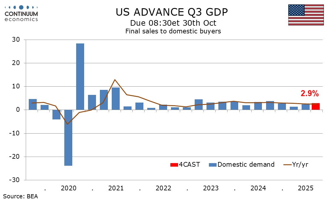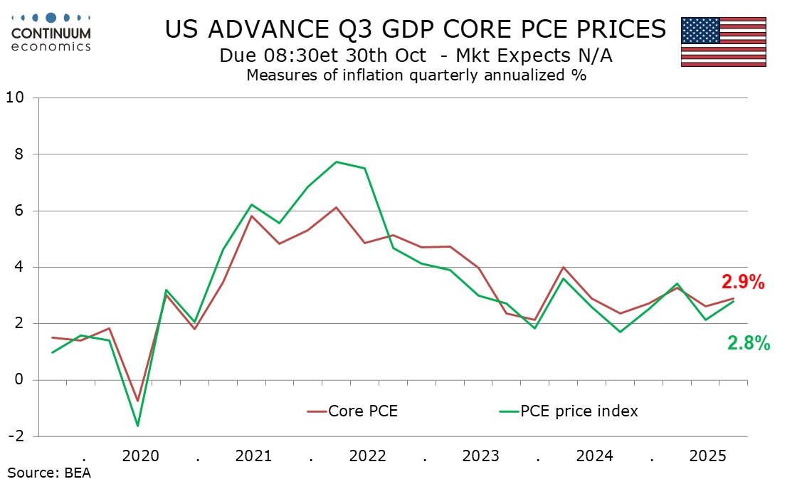 Prices appear to be regaining some momentum, even if the feed through from tariffs remains modest. We expect a 2.9% increase in the Q3 core PCE price index. This would be up from 2.6% in Q2 but would match the yr/yr pace. We expect overall PCE prices to rise by a similar 2.8% in Q3, and by 2.7% yr/yr.