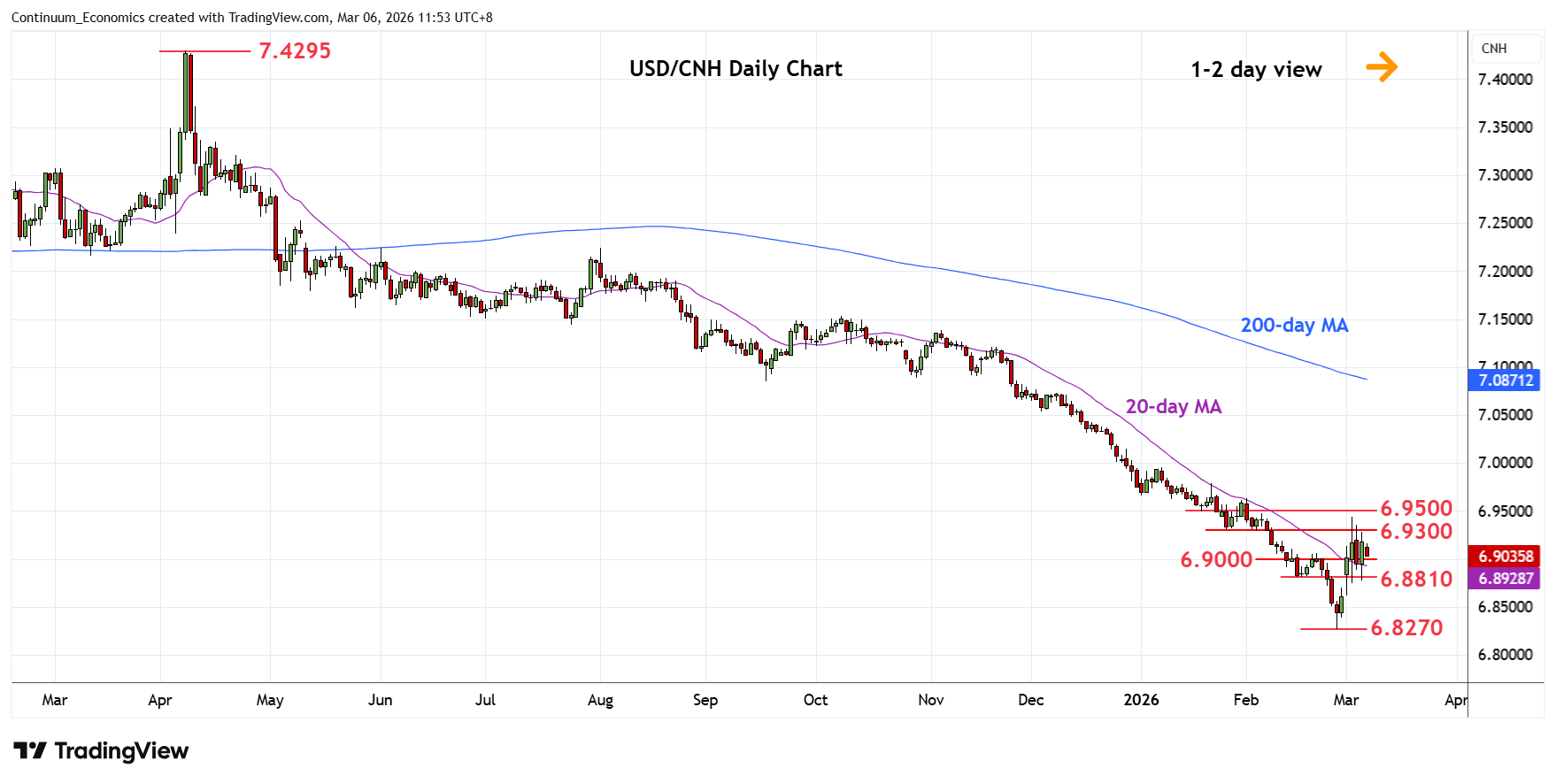 04:00 GMT - Extending choppy trade within the 6.9300/6.8810 area as prices consolidate gains from the 6.8270 February current year low. Positive daily and weekly studies suggest consolidation to give way to renewed buying interest later to retest 6.9430 high and 6.9500 resistance. Above these will see room to extend corrective gains to retrace losses from the October swing high to resistance at 6.9700 and 7.0000 figure. Meanwhile, support remains at the 6.9000/6.8810 area which should underpin. Only below this will fade the upside pressure.