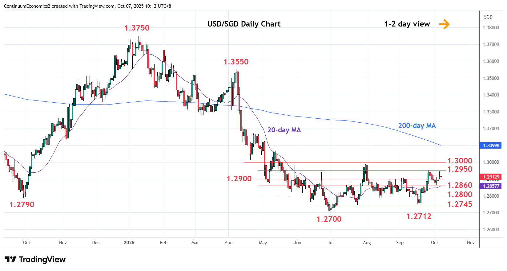 Chart USD/SGD Update: Consolidating retest of 1.2950 high