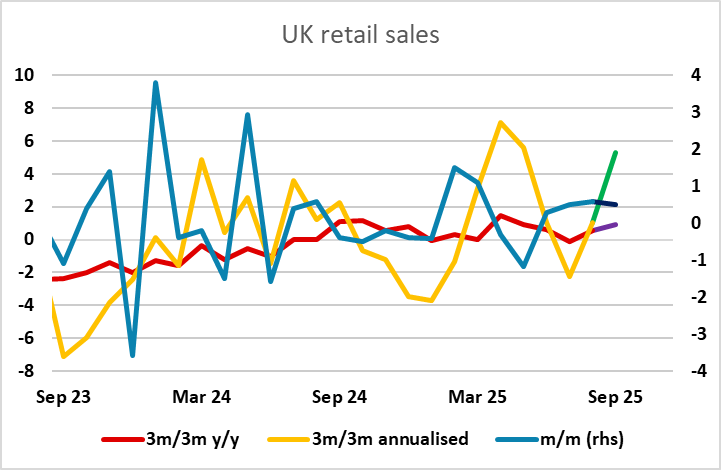 UK retail sales were stronger than expected in September, rising 0.5% m/m, and taking the 3m/3m trend to 3.4% annualised, the highest since May. While the monthly numbers saw strength in computers and online gold sales, the strength in the quarter was more broad-based, with most categories other than auto fuel seeing gains. GBP has moved modestly higher in response, but EUR/GBP remains above 0.87 after yesterday’s GBP weakness following the UK CPI data.