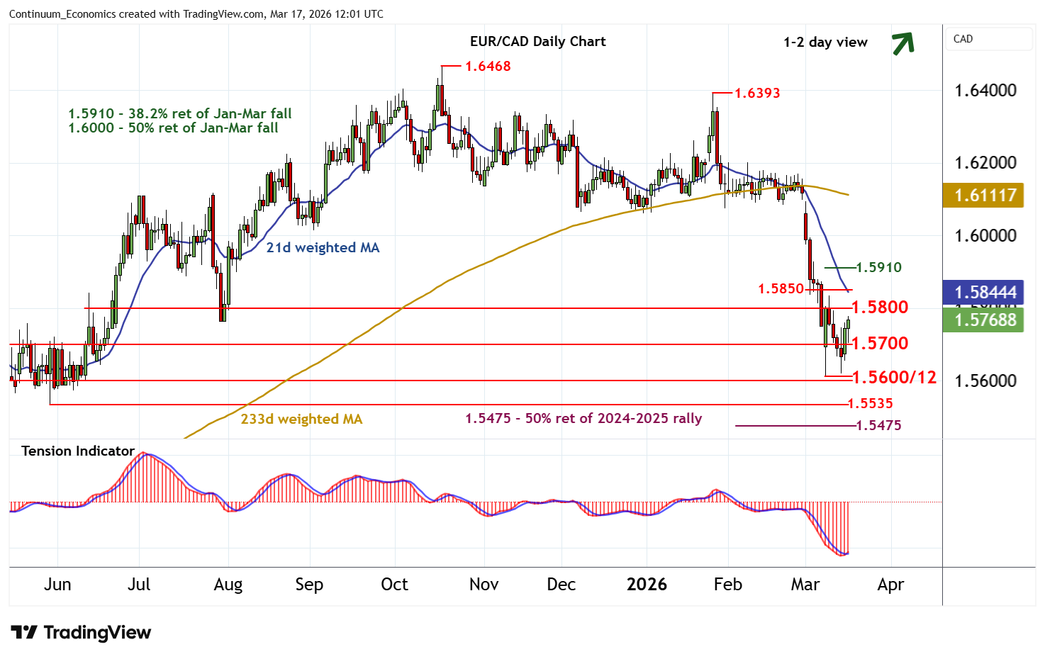 11:20 GMT - Cautious trade is giving way to a push higher, as intraday studies improve, with focus turning to congestion resistance at 1.5800. Oversold daily stochastics are unwinding and the daily Tension Indicator is also ticking up, highlighting room for a test above here. However, mixed/negative weekly charts should limit scope in renewed selling interest/consolidation beneath further congestiona round 1.5850. Meanwhile, support is raised to congestion around 1.5700. A close beneath here will help to stabilise price action. But a further close below congestion around 1.5600 and the 1.5615 current year low of 9 March is needed to turn sentiment negative and confirm continuation of October losses.