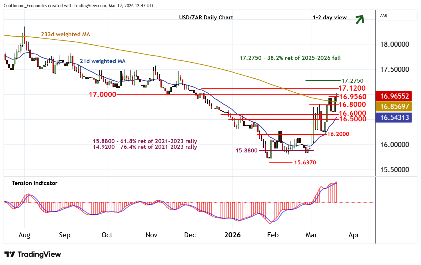 12:10 GMT - Anticipated gains have reached resistance within the 16.9560 current year high of 13 March and congestion around 17.000, where overbought intraday studies are prompting choppy trade. Daily readings are improving and broader weekly charts are positive, highlighting room for further gains in the coming sessions. However, a close above this range is needed to turn sentiment positive and extend late-January gains towards the 17.2750 Fibonacci retracement. Meanwhile, support is raised to congestion around 16.8000. A break beneath here, if seen, should give way to consolidation above 16.5000 - 16.6000.