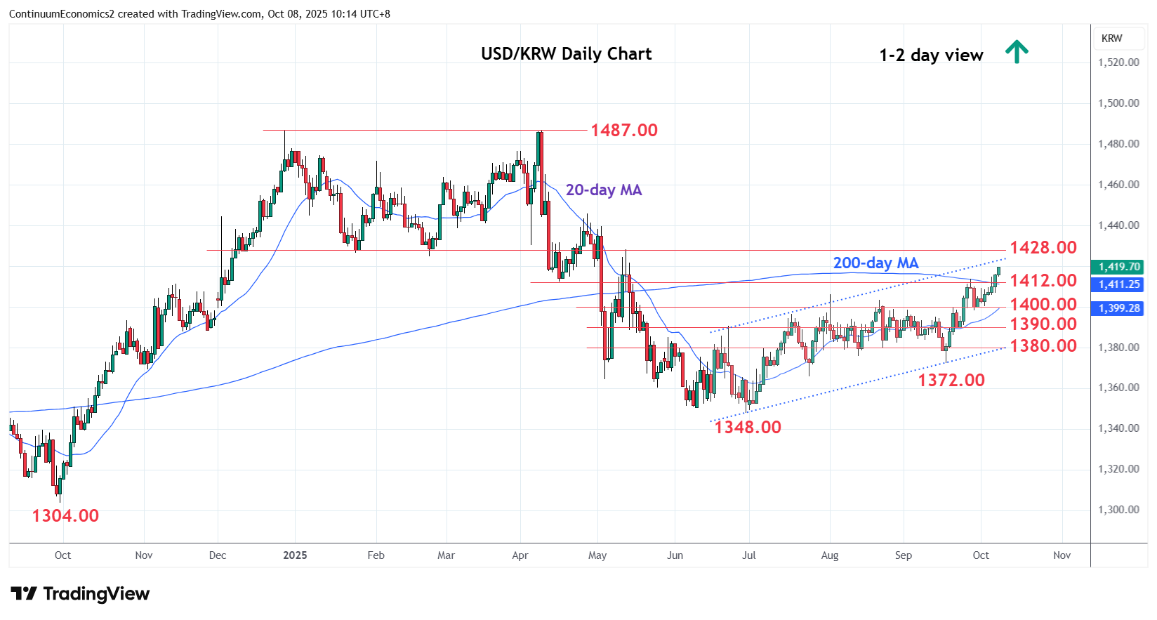 02:20 GMT - Break of the 1412.00/1414.00 resistance see prices extending gains from the 1372.00 September low and channel support from the June current year low. Above the 1420.00/1422.00 congestion and channel resistance will see room to strong resistance at 1428.00/1430.00 congestion. Meanwhile, support is raised to the April low and congestion area at 1412.00/1410.00 which should underpin. Below this will ease the upside pressure and open up room for pullback to support at the 1400.00 congestion.