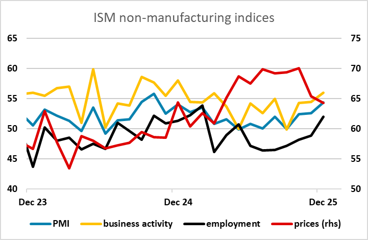The USD is gaining modestly on a stronger than expected non-manufacturing ISM survey, which shows strength across the board except for the price index which has edged lower, although from high levels. The USD reaction is modest with US yields also only rising modestly and still lower on the day having dipped earlier in the session. Slightly lower than expected JOLTS job opening data for November are to some extent offsetting the impact of the ISM survey.