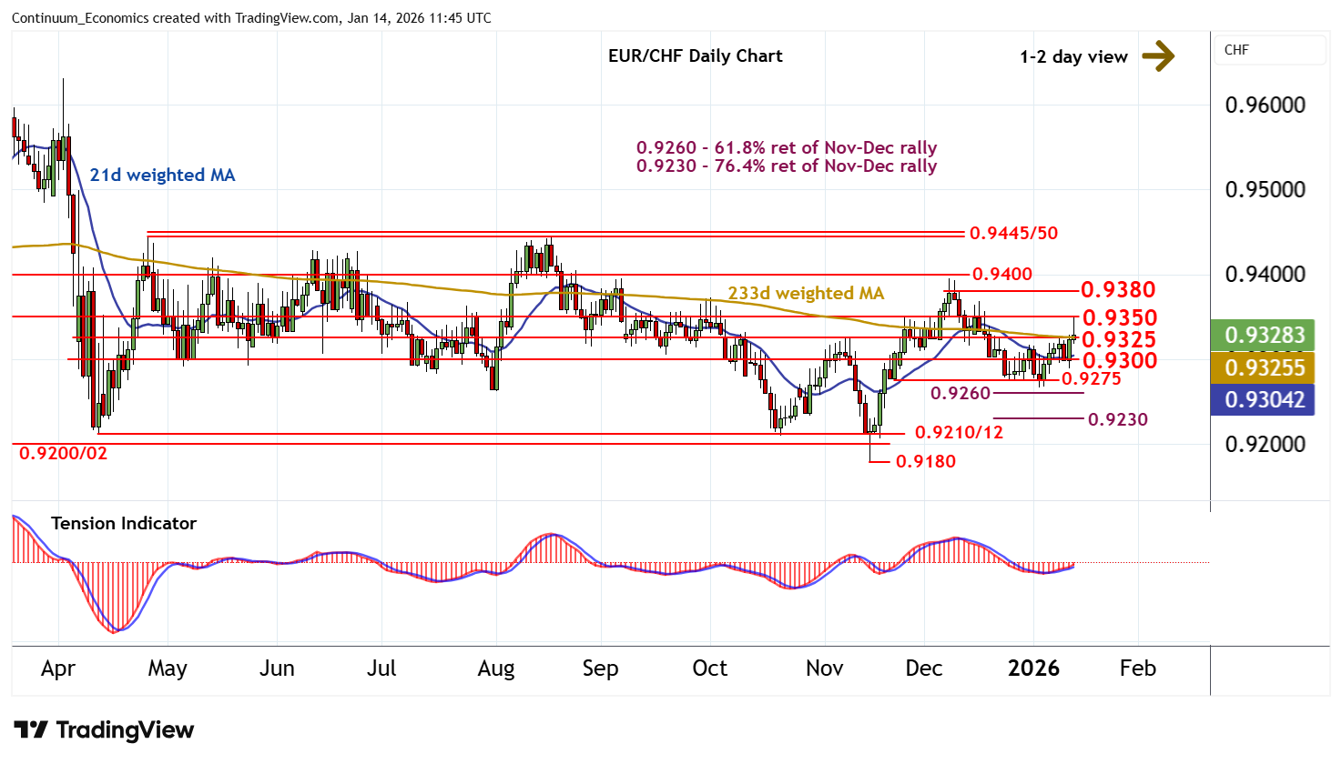 10:55 GMT - Anticipated gains have met selling interest at 0.9350, with a tick lower in overbought intraday stochastics prompting a pullback towards congestion support at 0.9325. Overbought daily stochastics are also turning down, suggesting room for a break back beneath here. But the rising daily Tension Indicator and mixed weekly charts should limit any break in renewed consolidation above 0.9300. Meanwhile, a break above 0.9350 would target 0.9380, where fresh consolidation is expected to appear.