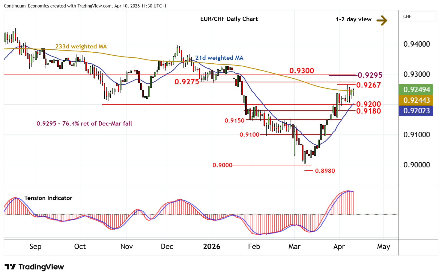 11:05 BST - Little change, as prices extend consolidation just shy of resistance at the 0.9267 monthly high of 31 March. Daily stochastics continue to track lower and the daily Tension Indicator is also under pressure, suggesting any initial tests could give way to renewed consolidation, before rising weekly charts prompt a break. A later close above here will improve price action and extend March gains into the broad 0.9275 - 0.9295/00 range. Meanwhile, support remains at the 0.9180/00 range, and should underpin any immediate setbacks.