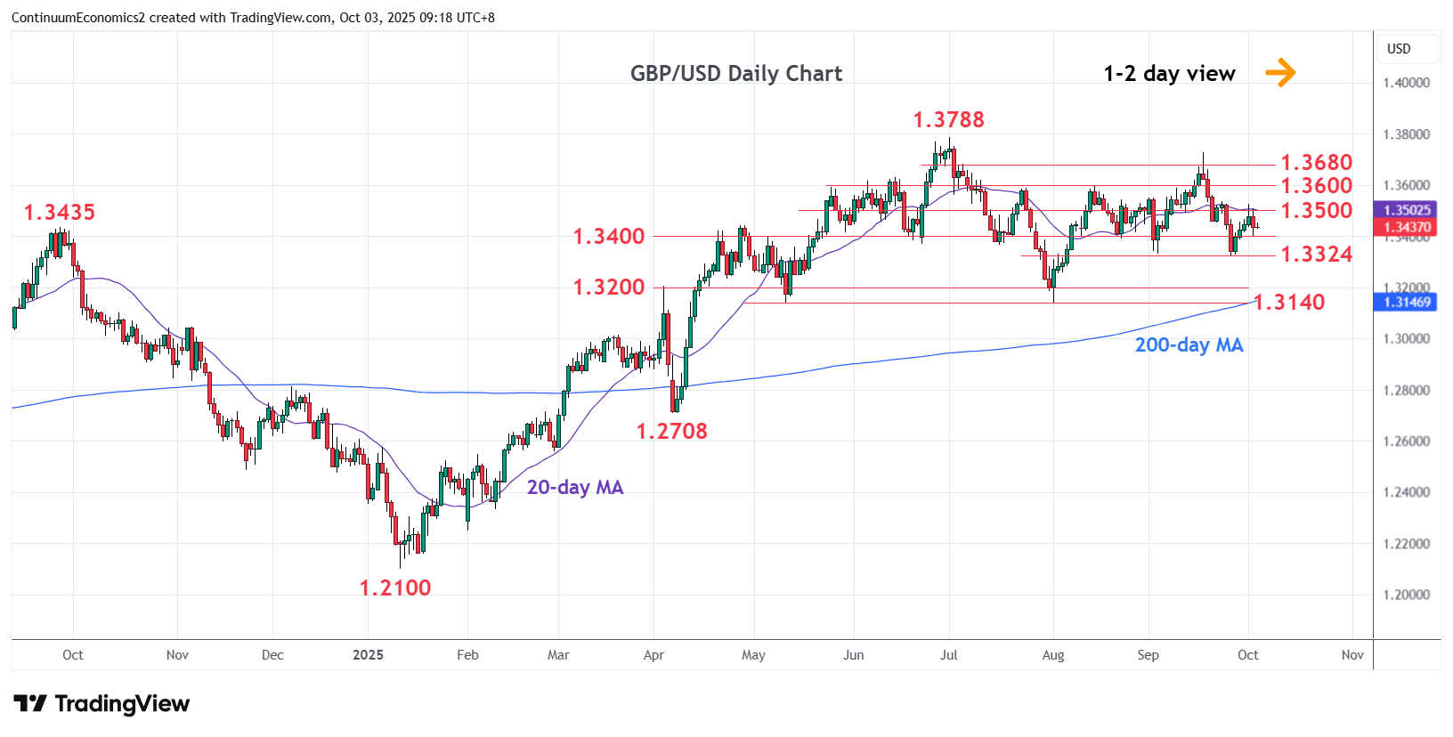 01:20 GMT - Rejection from the 1.3500/36 resistance has seen pullback to retest the 1.3400 level. Break here will open up room for retest of the 1.3324 low and threaten extension of losses from the 1.3726 September high. Lower will open up room to the 1.3300and 1.3200 congestion then the critical 1.3140 August low and 38.2% Fibonacci level. Meanwhile, resistance at the 1.3500/36 area is expected to cap. Would take break here to ease the downside pressure and open up room for retest of the 1.3600 August high.