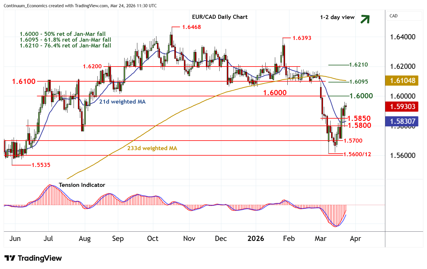 11:20 GMT - Little change, as prices extend cautious trade following recent sharp gains. Daily readings continue to rise, highlighting room for a later break above the 1.5960 high of 23 March and extension of March gains towards 1.6000. However, already overbought daily stochastics and the negative weekly Tension Indicator should limit any initial tests in renewed consolidation. Meanwhile, support remains at congestion around 1.5850. However, a break below 1.5800 would add weight to sentiment and extend losses towards further congestion around 1.5700.