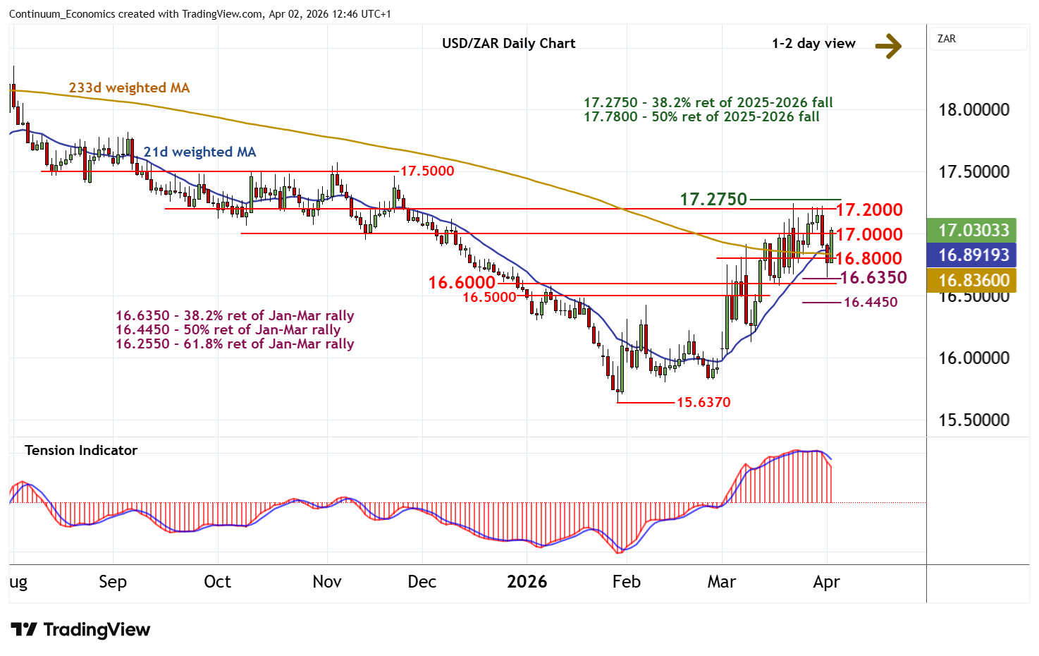 12:35 BST - The anticipated test below congestion support at 16.8000 has bounced from just above the 16.6000 - 16.6350 range, as intraday studies turn higher, with steady gains currently pressuring congestion resistance at 17.0000. Daily readings continue to track lower, however, and weekly stochastics are flat in overbought areas, suggesting immediate gains could be limited in renewed selling interest/consolidation beneath resistance at the 17.2000 congestion highs. The positive weekly Tension Indicator and improving longer-term charts see potential for a later break above here and continuation of January gains beyond the 17.2750 Fibonacci retracement. Meanwhile, a close below the 16.6350 Fibonacci retracement, if seen, would turn sentiment negative and extend late-March losses below 16.6000 towards the 16.4450 retracement.