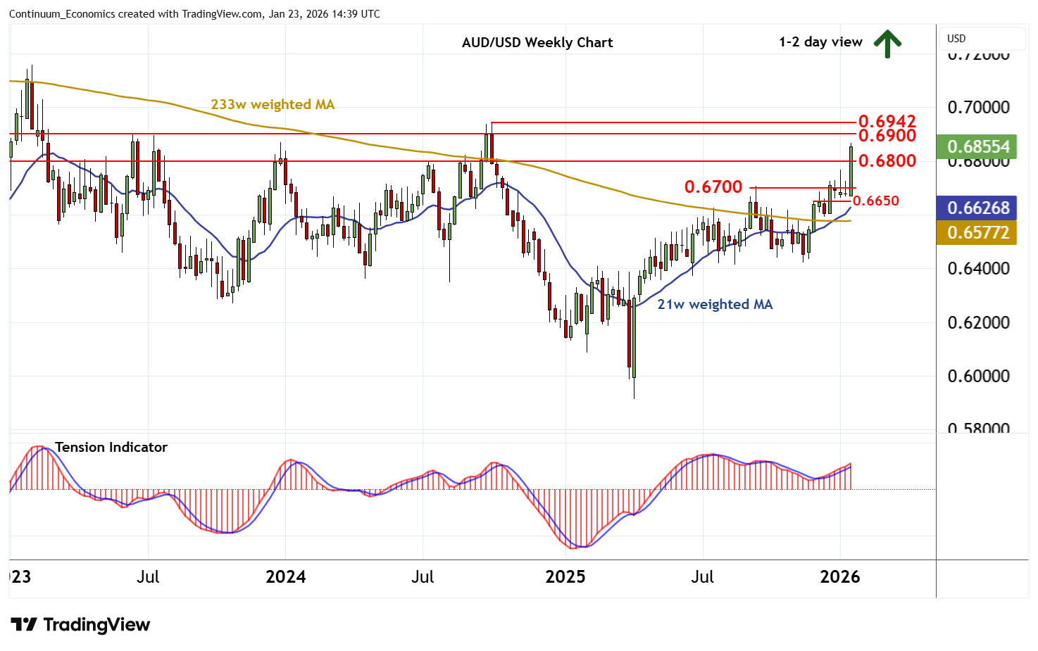 14:25 GMT - Little change, as prices extend April 2025 gains to post a fresh 2026 year high around 0.6865. Daily readings continue to rise and broader weekly charts are positive, highlighting room for a test of resistance at 0.6900. However, already overbought weekly stochastics are expected to limit any immediate break beyond here in profit-taking/consolidation beneath critical resistance at the 0.6942 year high of September 2024. Meanwhile, support is raised to 0.6800 and should underpin any immediate setbacks.