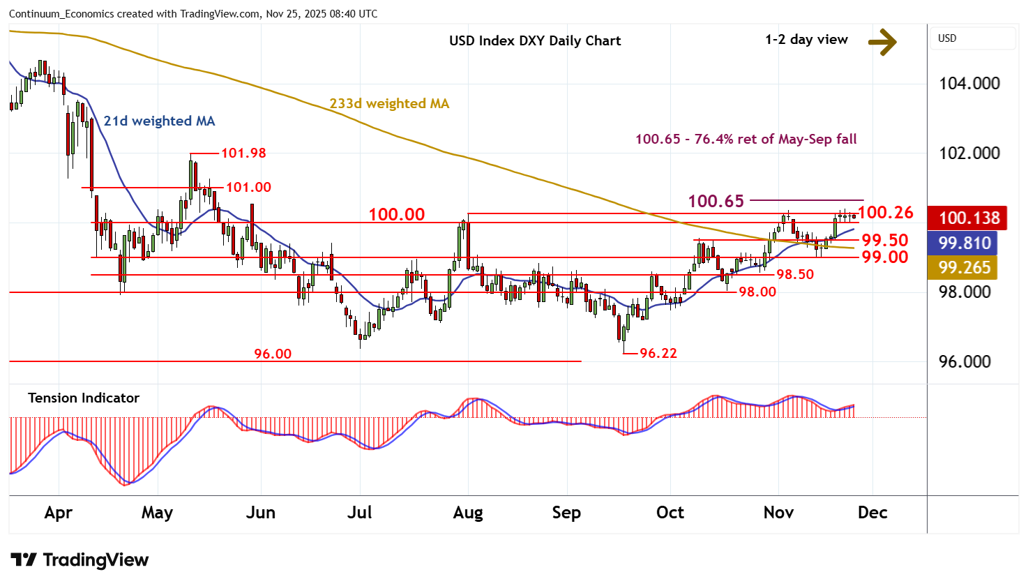 08:40 GMT - Little change, as prices extend cautious trade within strong resistance at congestion around 100.00 and the 100.26 monthly high of 1 August. Intraday studies are under pressure, highlighting room for a break back below 100.00. But a tick higher in daily stochastics and the positive daily Tension Indicator should limit scope in renewed consolidation/buying interest above support at the 99.50 break level. Following cautious trade, fresh gains are looked for. A break above 100.00/26 will improve sentiment and extend mid-September gains towards the 100.65 Fibonacci retracement, where mixed weekly charts could prompt fresh selling interest/consolidation.