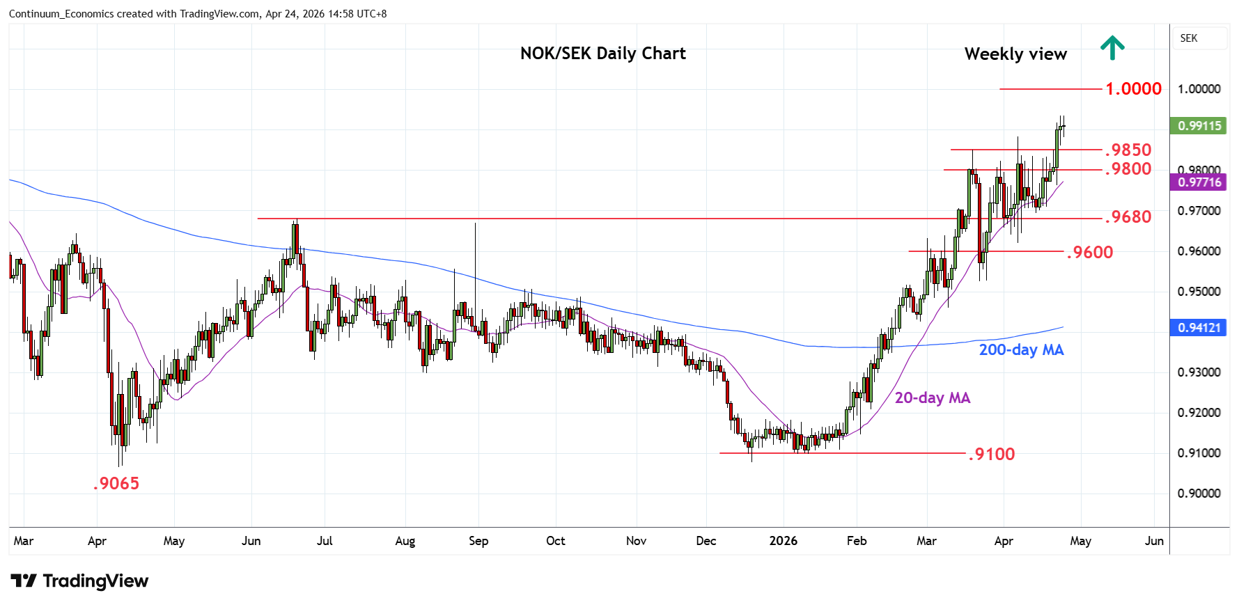 07:30 GMT - Break above the .9800 level at the start of the week and the .9850 March high has seen gains to fresh year high at .9935. Overbought daily and weekly studies caution corrective pullback to unwind overbought daily and weekly studies but further gains cannot be ruled out. Higher will see scope to target the parity level where reaction can be expected. Meanwhile, support is raised to the .9850/.9800 March high and congestion area. Would take break here to ease the upside pressure and see room for deeper pullback to the strong support at the .9700/.9680 congestion and June 2025 high.