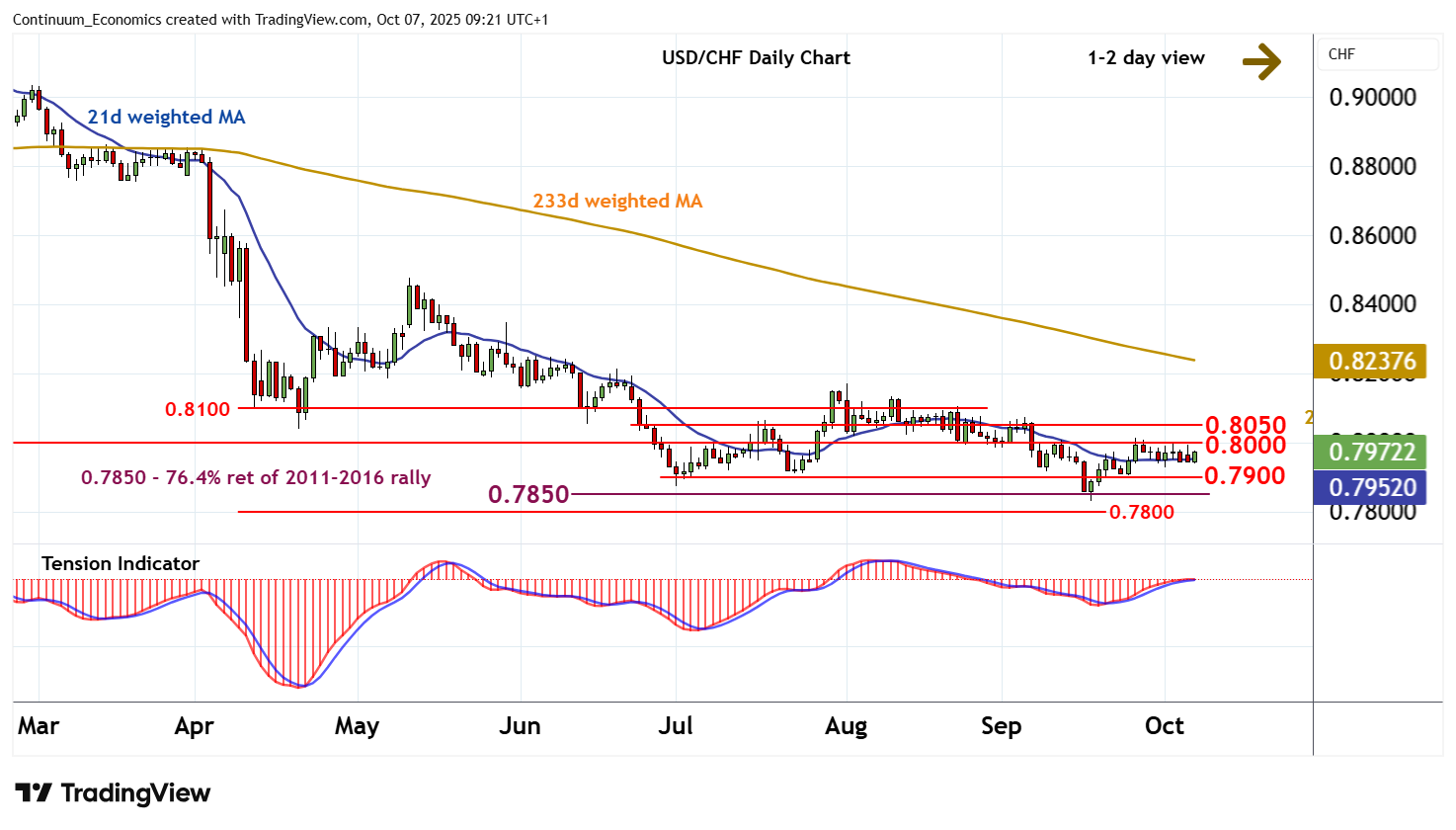 09:15 BST - Quiet trade, with prices balanced in consolidation around 0.7950. Intraday studies are rising, highlighting potential for a move higher towards congestion resistance at 0.8000. But mixed/negative daily readings are expected to limit any initial tests in consolidation, before rising weekly charts prompt a break. A close above 0.8000 will open up 0.8050, with room for continuation towards congestion around 0.8100. Meanwhile, support is down to congestion around 0.7900 and should underpin any immediate setbacks.