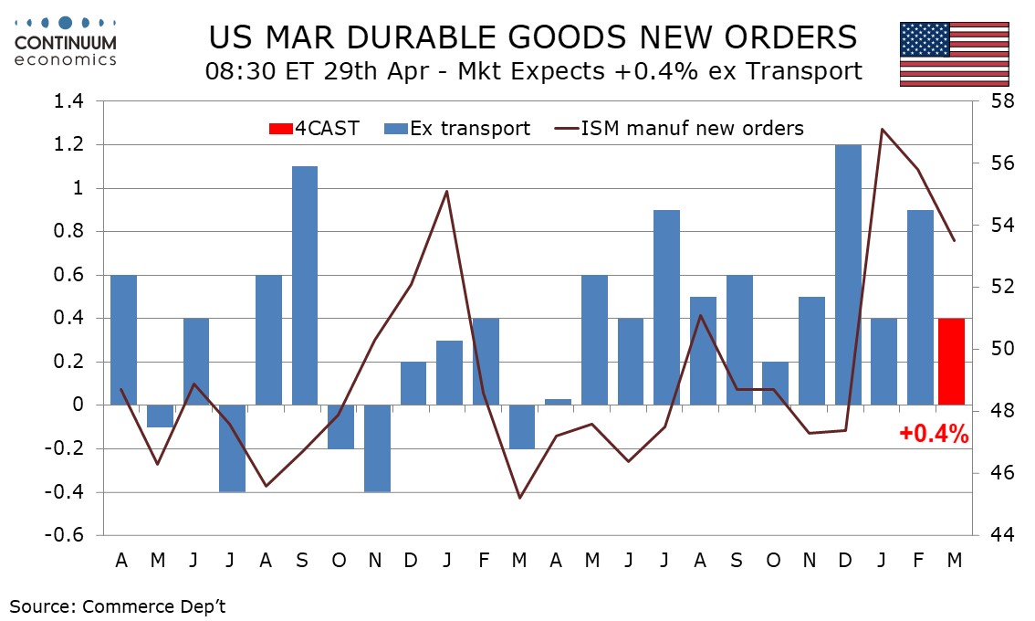 We expect March durable goods orders to increase by 1.0% overall, with a 0.4% increase ex transport, with most of the transport increase coming in defense. Ex transport trend will remain positive, but a 0.4% increase would be slightly below recent trend. We expect a 0.5% increase ex defense.