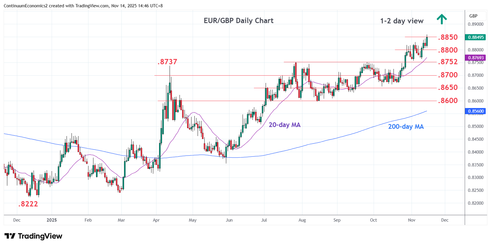 07:00 GMT - Break above the .8830 high has seen gains to fresh year high at .8859. Bullish structure from the .8222 low of December 2024 keep pressure on the upside and higher will see room to target the April 2023 high at .8875 and .8885, 61.8% Fibonacci level. Higher still, will see extension to the .8900 level and .8925, March 2023 high. Meanwhile, support is at the .8800 figure which is expected to underpin. Would take break here to turn focus lower to strong support at the .8752 and .8737, July and April highs.
