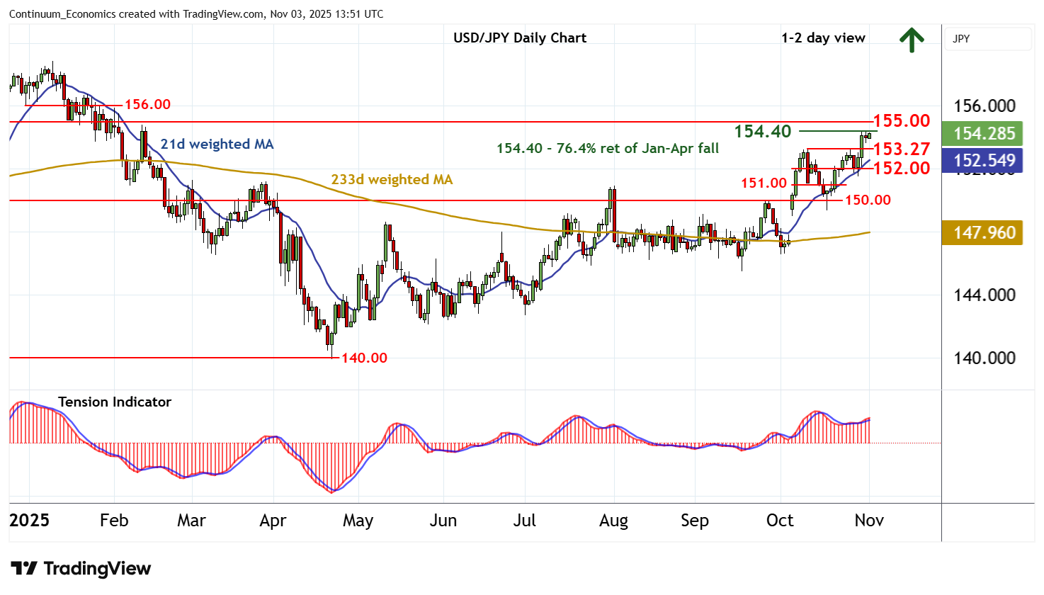 13:45 GMT - Still little change, as prices extend consolidation beneath strong resistance at the 154.40 Fibonacci retracement. Intraday studies are under pressure, highlighting potential for a minor pullback. But rising daily readings and positive weekly charts are expected to limit any tests lower in renewed buying interest towards the 153.27 weekly high of 10 October. Following cautious trade, fresh gains are looked for. A close above 154.40 will improve sentiment and extend April gains towards congestion around 155.00. Beyond here is the 155.88 high of February and congestion around 156.00. But flat overbought weekly stochastics are expected to limit any tests of here in profit-taking/consolidation. Meanwhile, a close below 153.27, if seen, would turn sentiment neutral and prompt consolidation above congestion around 152.00.