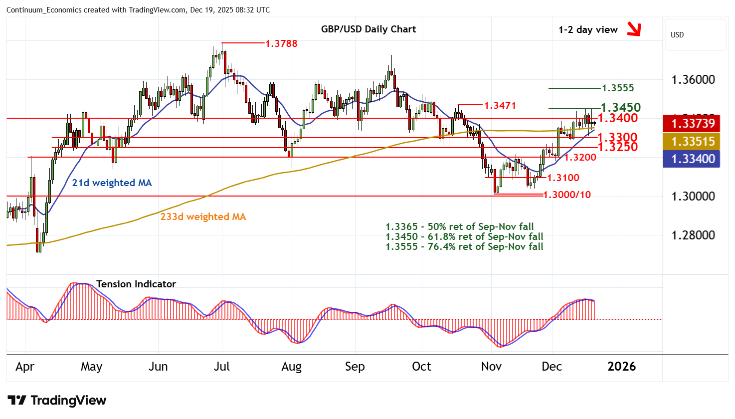 08:10 GMT - The retest above congestion resistance at 1.3400 has met renewed selling interest at the 1.3450 Fibonacci retracement, with prices once again balanced in cautious trade beneath 1.3400. Daily stochastics and the daily Tension Indicator continue to track lower, highlighting room for a drift lower towards congestion support at 1.3300. A break will add weight to sentiment and open up congestion around 1.3250. But rising weekly charts should limit any deeper losses in renewed buying interest/consolidation above 1.3200. Meanwhile, a close above 1.3450 is needed to turn sentiment positive and confirm continuation of November gains beyond the 1.3471 weekly high of 17 October towards congestion around 1.3500.