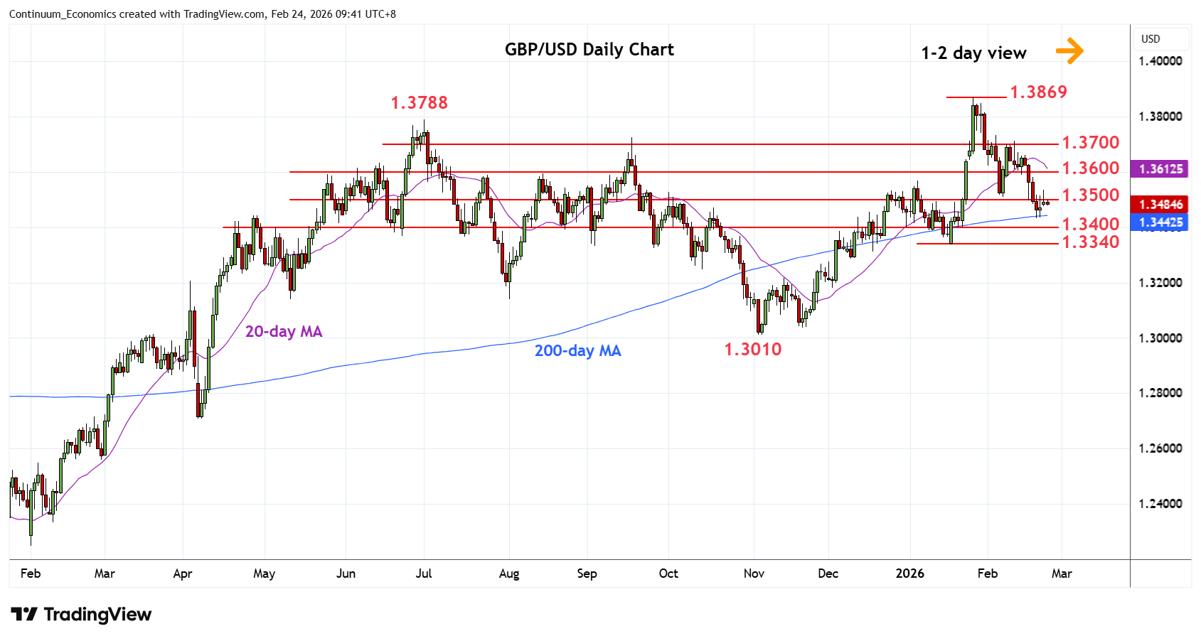 Higher in consolidation above the 1.3440 Fibonacci level and 200-day MA but gains remain limited above the 1.3500 level