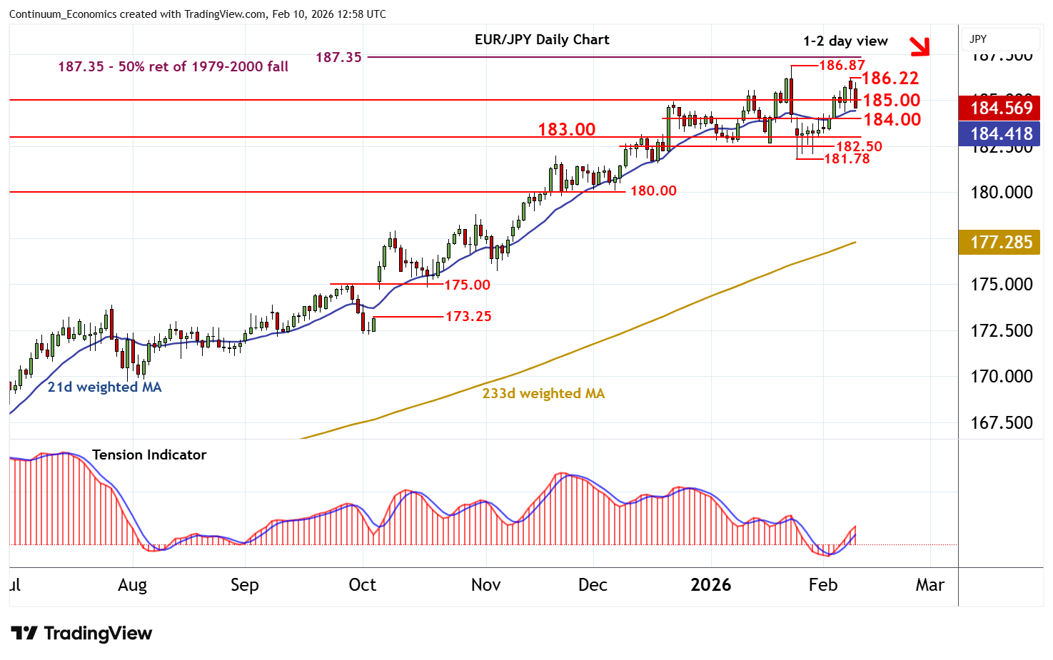 12:30 GMT - The anticipated push higher towards critical resistance at the 186.87 current year high of 23 January has not been seen, as consolidation gives way to profit-taking and a break below 185.00. Intraday studies are negative and daily stochastics are turning down, highlighting room for continuation towards congestion support at 184.00. However, the rising daily Tension Indicator is expected to limit any initial break in renewed consolidation above 183.00, before negative weekly charts extend losses still further. Meanwhile, a close above 185.00, if seen, would help to stabilise price action and prompt consolidation beneath the 186.22 high of 9 February.