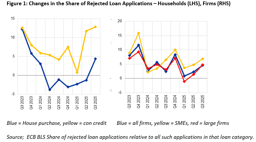 President Lagarde today suggested that monetary transmission mechanism is running smoothly in every way. But as the recent ECB SAFE and BLS survey published earlier this week this is a complacent view. In fact, and hardly a surprise despite the ECB suggestions to the contrary as the reported net tightening credit standards merely accentuates trends in the two previous Bank Lending Surveys (BLS). This updated BLS therefore echoes what we have seen in other ECB surveys and in actual credit dynamics and thus underscores that banks are rationing the supply of credit as well as not fully passing on a clear lowering its costs (NB; the BLS noted a net increase in the share of rejected loan applications – for consumer as well as companies – see Figure 1). As such the latest BLS both corroborates and continues an ever worrying pattern, namely ever clearer weakness in corporate credit and which suggest ever more clearly that banks are increasing lending standards to firms, especially those exposed to the export sectors. The question is whether this is even more tangible evidence that the threat posed by U.S. tariffs is therefore becoming more of a reality rather than having diminished as is perhaps the central feature of the ECB update we received today – ie global risks and tensions have diminished. Thus while the ECB may feel it (and the EZ) is a ‘good place’ we are warier whether it can stay there or at least improve in the manner that the ECB is both implicitly and explicitly suggesting.