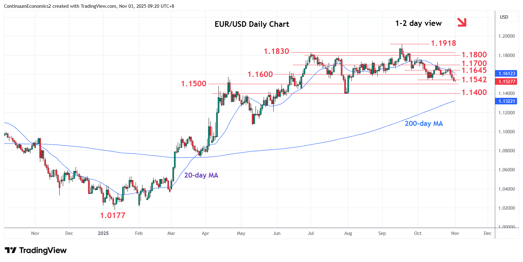 Prices remain under pressure following break of strong support at 1.1542, 9 October low