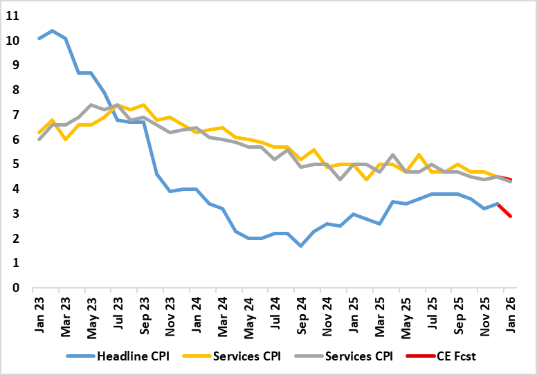 UK policy makers may not be able to say they have won the war against inflation, but a clear victory may be seen in the batter likely in the next few months with a likely return to the 2% target by April These projected falls are likely to commence with the looming January numbers (Figure 1) where airfare distortions which pushed up the December outcome should unwind, and where base effects may reduce food inflation. As a result, we see the headline CPI rate falling from December’s 3.4% to 2.9% (as does the BoE) and also where services and the core should fall by around 0.3 ppt to 4.2% ad a new cycle low of 2.9% for the latter. Notably such declines have been signalled for some time by adjusted m/m data (Figure 2), with already-soft wage figures likely to result in lower underlying inflation ahead (Figure 3). Such data should encourage further speculation that the BoE will ease afresh next month.