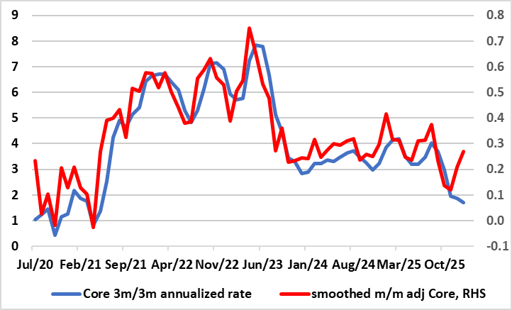 Against this backdrop, headline CPI inflation is projected to slow sharply, to 2.0% in Q226, our view being a notch softer than BoE thinking. And we see it largely staying there though the rest of 2026. Perhaps more notably we also see core CPI inflation falling to around the 2% target in Q2 and then staying there, this being a softer outlook than that of the BoE. Partly this reflects nothing more than an extension of what recent adjusted m/m data have been suggesting with core rates on this basis already consistent with the 2% target (Figure 2). But is also reflects more fundamental factors. Firstly, is the expectation that currently soft non-energy goods inflation (currently around 1% y/y) may soften even further as weak global demand and probable dumping of goods by China produce once destined for the U.S.