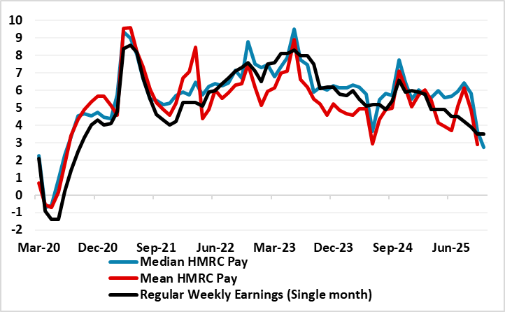 But the BoE now suggest that wage growth of around 3-3.25% is consistent with the 2% CPI target, this assuming productivity growth of 1% per year. We think that wage inflation may already be around this rate as labor market numbers (Due Feb 17) may highlight. Admittedly using ex-bonus private sector earrings data (which are not a pure wage measure as they are affected by overtime/hours worked too), such wage pressures are nearer 3% on an adjusted three-month annualised basis. But pay data from HMRC are even weaker, already showing wage readings running below 3% (Figure 3).