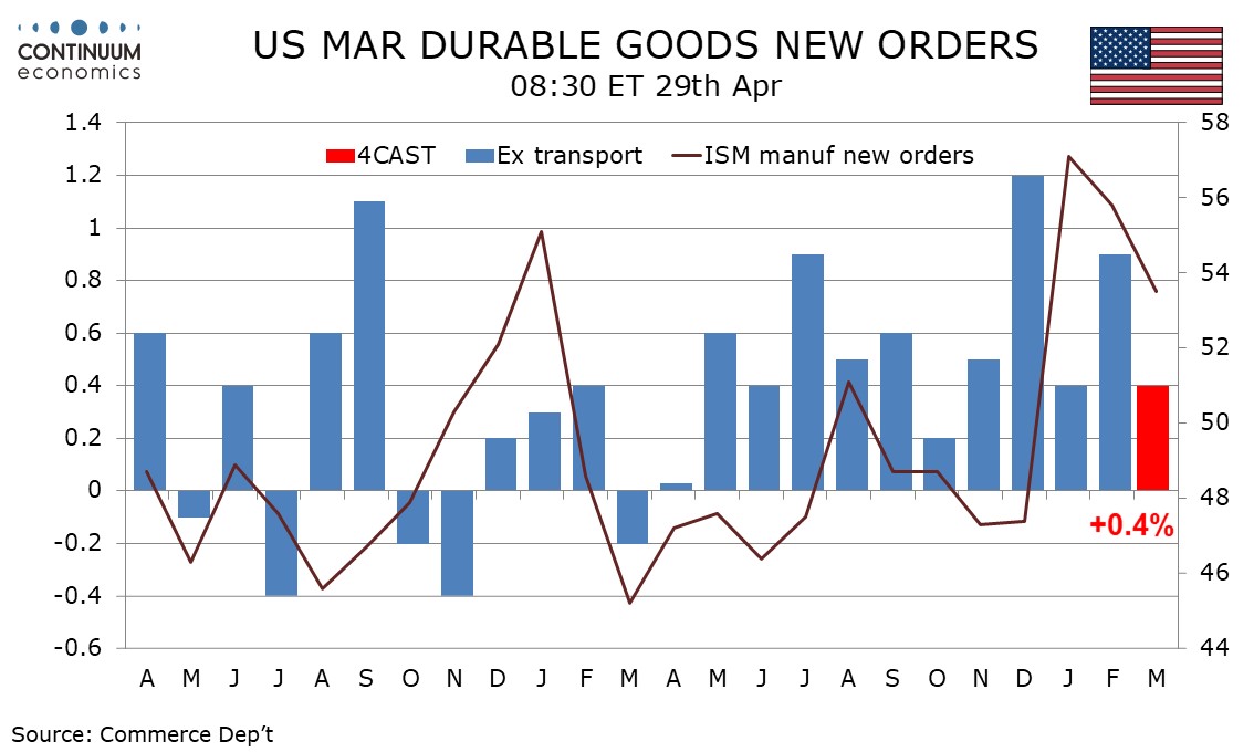 We expect March durable goods orders to increase by 1.0% overall, with a 0.4% increase ex transport, with most of the transport increase coming in defense. Ex transport trend will remain positive, but a 0.4% increase would be slightly below recent trend. We expect a 0.5% increase ex defense.