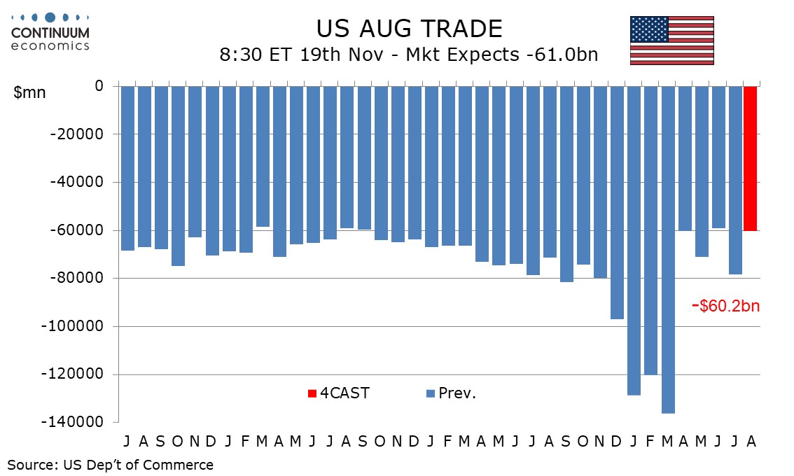 Advance goods data (released back on September 25) showed a 1.3% decline in exports after a flat July and a 7.0% decline in imports to reverse a 7.0% increase in July. Industrial supplies led the decline in imports after leading July’s increase. We expect similar outcomes in this report, leaving a goods deficit of $86.4bn, down from $103.9bn in July. Canadian trade data for August showed a narrowing of its surplus with the U.S. after an increase in July. September Canadian trade data has been delayed due to an absence of data that is usually provided by the U.S. to Canada, but not during a government shutdown.