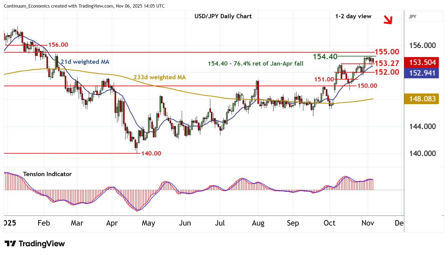Little change, as prices extend cautious trade beneath strong resistance at the 154.40 Fibonacci retracement