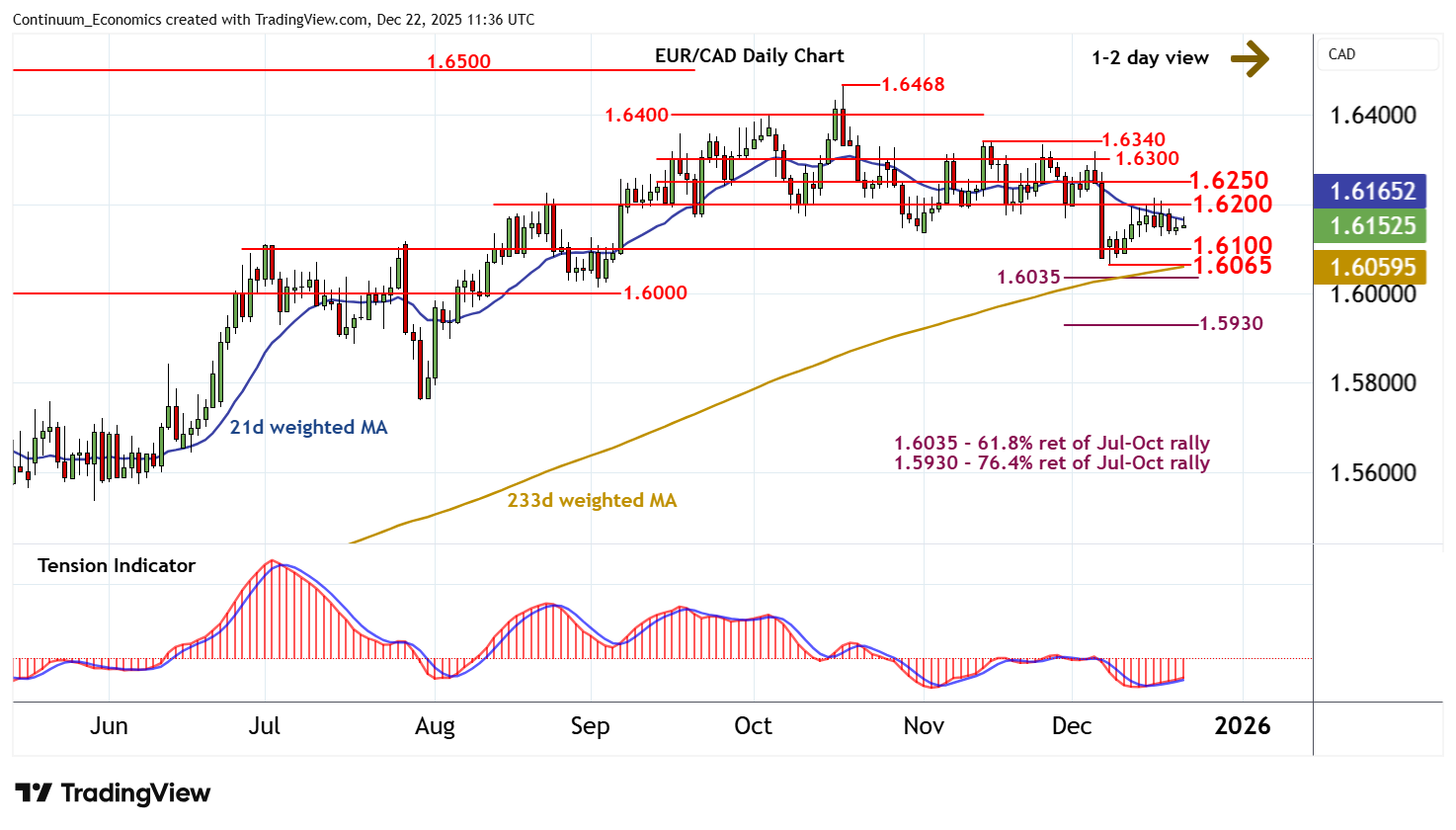 11:30 GMT - Little change, as prices extend consolidation around 1.6150. Intraday studies are mixed/negative, highlighting room for a drift down to congestion support at 1.6100. But mixed daily readings are expected to limit any initial tests in consolidation, before mixed/negative weekly charts and deteriorating longer-term readings prompt further losses. A close below the 1.6065 weekly low of 8 December would turn sentiment negative and extend mid-October losses towards the 1.6035 Fibonacci retracement. Meanwhile, any fresh tests above congestion resistance at 1.6200 should meet renewed selling interest beneath further congestion at 1.6250.