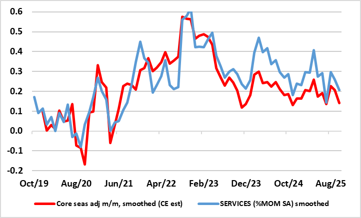 In contrast to food inflation in neighbouring economies, that for the EZ seems under control, actually slipping back last month despite some adverse weather of late. Admittedly, services inflation, at 3.2% in September, moved up a bare 0.1 ppt from what was the lowest since March 2022 but despite this rise, it not only matches ECB thinking for the last quarter but still seems to be belatedly following in the footsteps of lower wage pressures and where survey data for the sector also shows weaker price pressures. As a result, this trend and noise could bring the headline and core rate are seen dipping below 2% in Q4 with base effects pulling the headline down toward 1.5% in Q1, especially if demand weakness starts to accentuate what have largely been supply factors driving the disinflation process hitherto (see below). Notably, as recent calendar distortions unwind, what has looked like fresh price pressures in seasonally adjusted short-term m/m movements for core and services have reversed and are consistent with on-target inflation (Figure 2)!