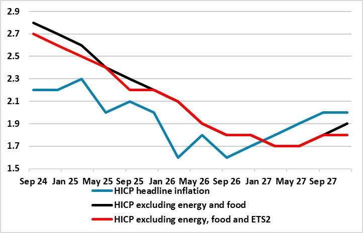 As Figure 3 shows, and as we have highlighted already, according to current ECB thinking, ETS2 may add 0.2 ppt to inflation through 2027, this causing the pick-up in the headline to 2.0% by the end of that year – ex food and energy/ETS2 inflation stays at 1.8% by end-2027. However, at this juncture, while it is too early to assess how (and when) ETS2 would affect headline inflation over the longer term, the inflationary impact in 2027 might be short-lived, so that any one-off adjustment could unwind in 2028, pulling the headline back down to well below 2%. This is all the more important (to some extent) as in the December staff projections, the ECB forecast horizon will be formally extended to 2028, the question being to what extent this may shed better light on the way ETS2 would likely play out beyond 2027. This is important as politics suggest there is a risk that national governments might delay or only partially implement ETS2, which could lead to a more pronounced HICP undershoot in 2027 albeit with a higher-than-otherwise projection for 2028 a possible result.