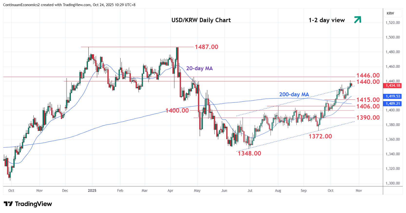 02:40 GMT - Break above congestion at 1430.00 has seen follow-through above the 1435.00 high to reach the 1440.00 level. Positive daily and weekly studies suggest scope for break here to further extend gains from the 1348.00, June current year low. Higher will see room for extension to strong resistance at 1446.00, 28 April and 2022 year highs. Meanwhile, support is raised to 1430.00. Below here will open up room for deeper pullback to the 1420.00/1415.00 congestion and 16 October low which is expected to underpin and sustain the broader gains from 1372.00, September low.
