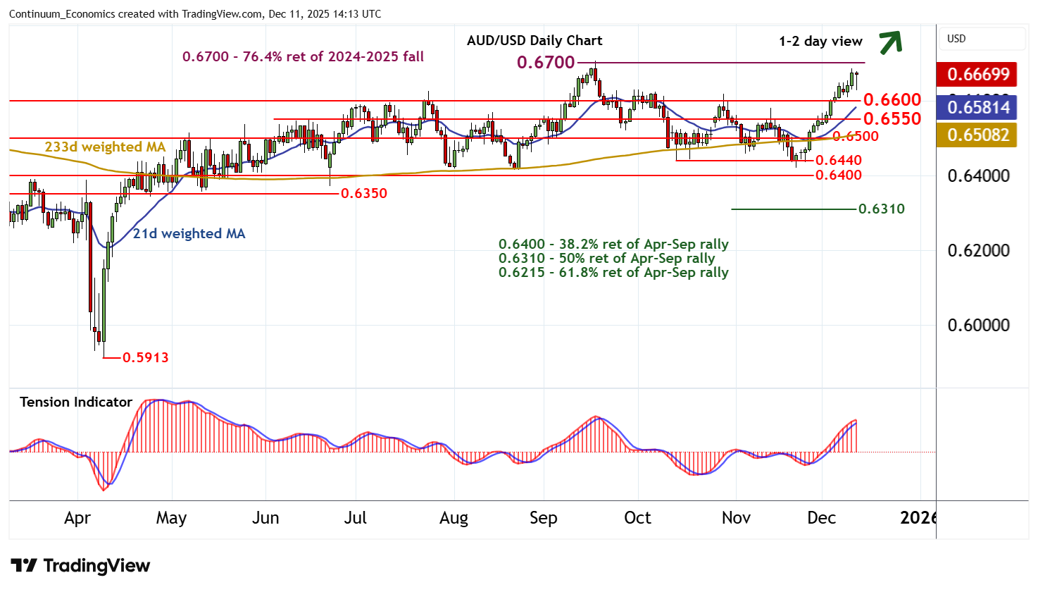 14:05 GMT - Cautious trade has posted a fresh near-term high at 0.6685, where mixed intraday studies are prompting choppy trade. A tick higher in overbought daily stochastics highlights potential for a test of critical resistance at the 0.6700 Fibonacci retracement and the 0.6705 current year high of 17 September. But the flattening positive daily Tension Indicator is expected to limit any initial tests in consolidation, before rising weekly charts prompt a break. A close above here will improve sentiment and open up a test of critical resistance at 0.6700/05. Meanwhile, support remains down to congestion around 0.6600. A close beneath here would turn sentiment neutral and give way to consolidation above further congestion around 0.6550.