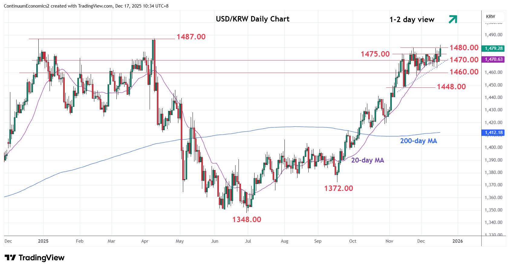 No follow-through on break of the 1480.00 November high but pressure remains on the upside