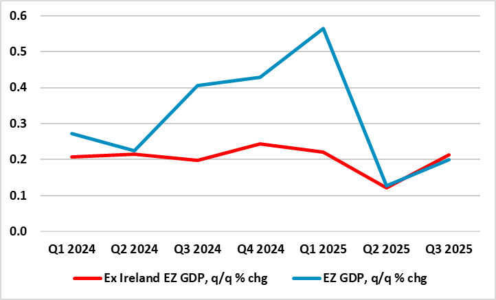 It continues to be the case that, for an economy that has seen repeated upside surprises and apparently above trend growth, now some 1.3% in the year to Q3, GDP data do not seem to have had much impact is shaping, let alone dominating, ECB policy thinking save to encourage a Council view of EZ economic resilience. The Q3 rise of 0.2% q/q may have bettered ECB thinking, but we would caution the ECB from taking too much positivity from the GDP backdrop, as we think it will only engender even more policy complacency. Indeed, we remind that EZ underlying growth has been nowhere need that of the recorded headlines, actually averaging no more than the 0.2% Q3 outcome, ie half what the y/y rate would suggest. Moreover, divergences are even clearer not just between the likes of (still stagnant) Germany and immigration-induced Spanish strength but also with France having to rely on exports to accomplish the moderate growth seen of late. Even so, the Q3 figure, at least arithmetically, does imply faster average EZ 2025 growth – we have upgraded the picture by 0.2 ppt to 1.3% but retain our 0.8% 2026 call.