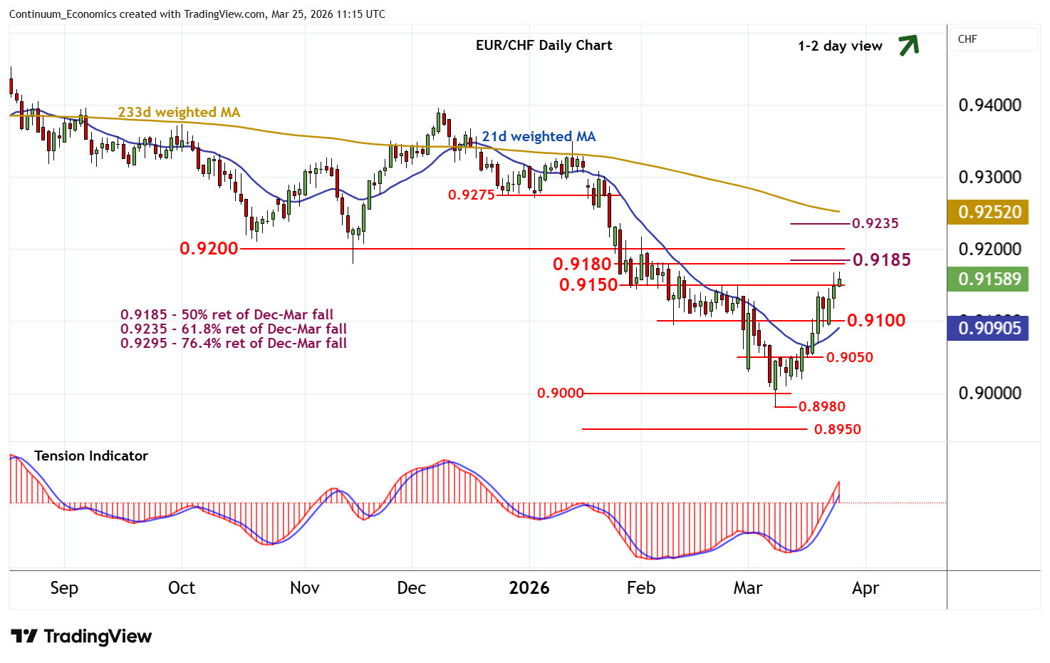 10:40 GMT - Anticipated gains are giving way to consolidation above 0.9150, as intraday studies turn mixed. However, daily readings have ticked higher and broader weekly charts are rising, highlighting room for continuation of March gains towards strong resistance at congestion around 0.9180 and the 0.9180 Fibonacci retracement. Already overbought daily stochastics could limit any initial tests of here in consolidation, before prices extend still further. Meanwhile, support is raised to 0.9150. A close back beneath here, if seen, will help to stabilise price action and prompt fresh consolidation above 0.9100.