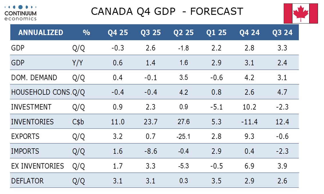 We expect Q4 Canadian GDP to decline by 0.3% annualized, marginally softer than an unchanged estimate made by the Bank of Canada with January’s Monetary Policy report. This would be consistent with December GDP rising by 0.1% as projected with November’s data.