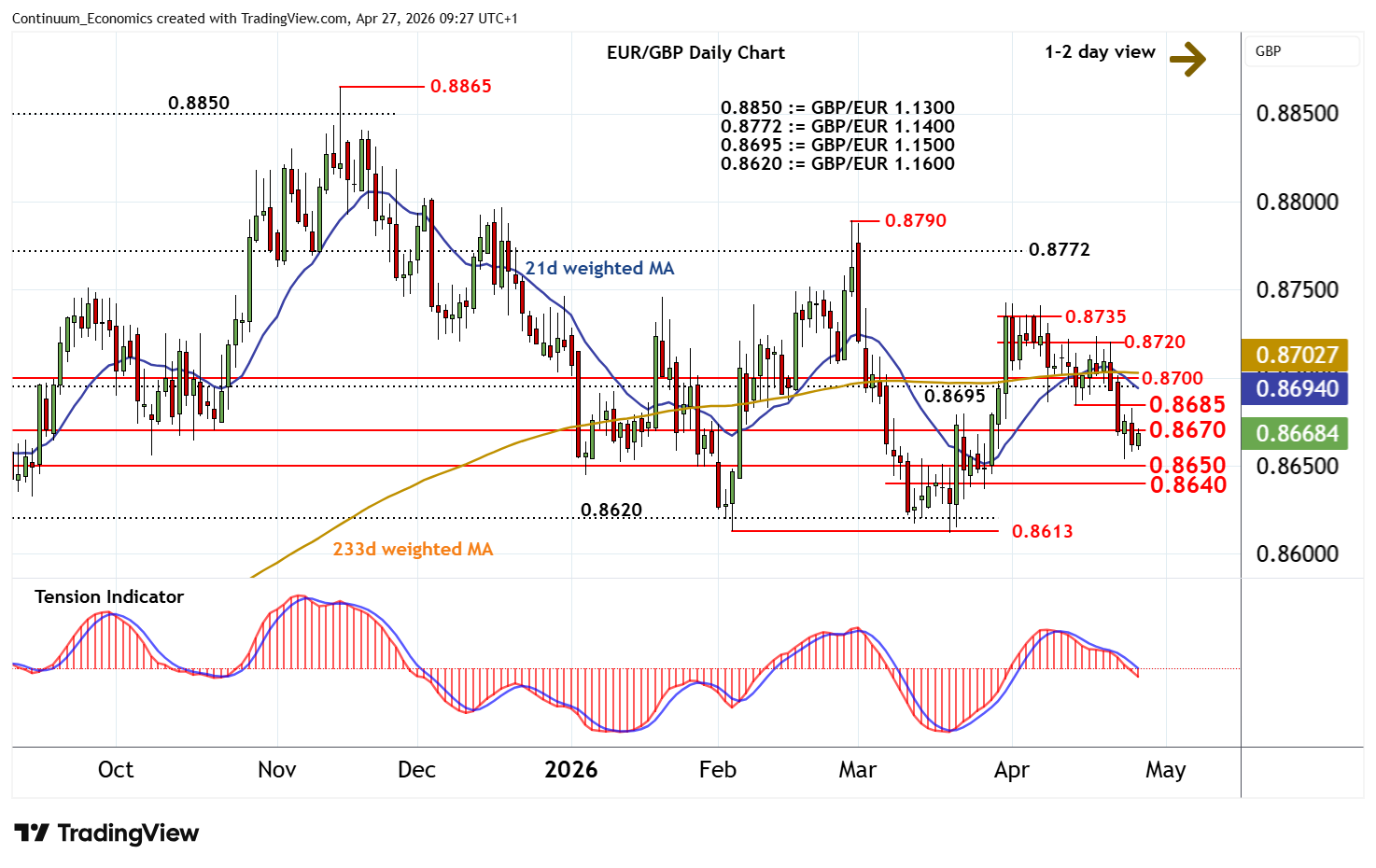 09:10 BST - Little change, as mixed intraday studies and flat oversold daily stochastics keep near-term sentiment cautious and prompt consolidation around 0.8660. The daily Tension Indicator continues to track lower and broader weekly charts are coming under pressure, highlighting room for fresh losses in the coming session. Support is at congestion around 0.8650 and extends to intraday lows around 0.8640. Initial tests of here should give way to consolidation. A break, however, will add weight to sentiment and open up critical support within 0.8613/20. Meanwhile, a close above congestion resistance at 0.8670 should give way to consolidation beneath the 0.8685 weekly low of 14 April.