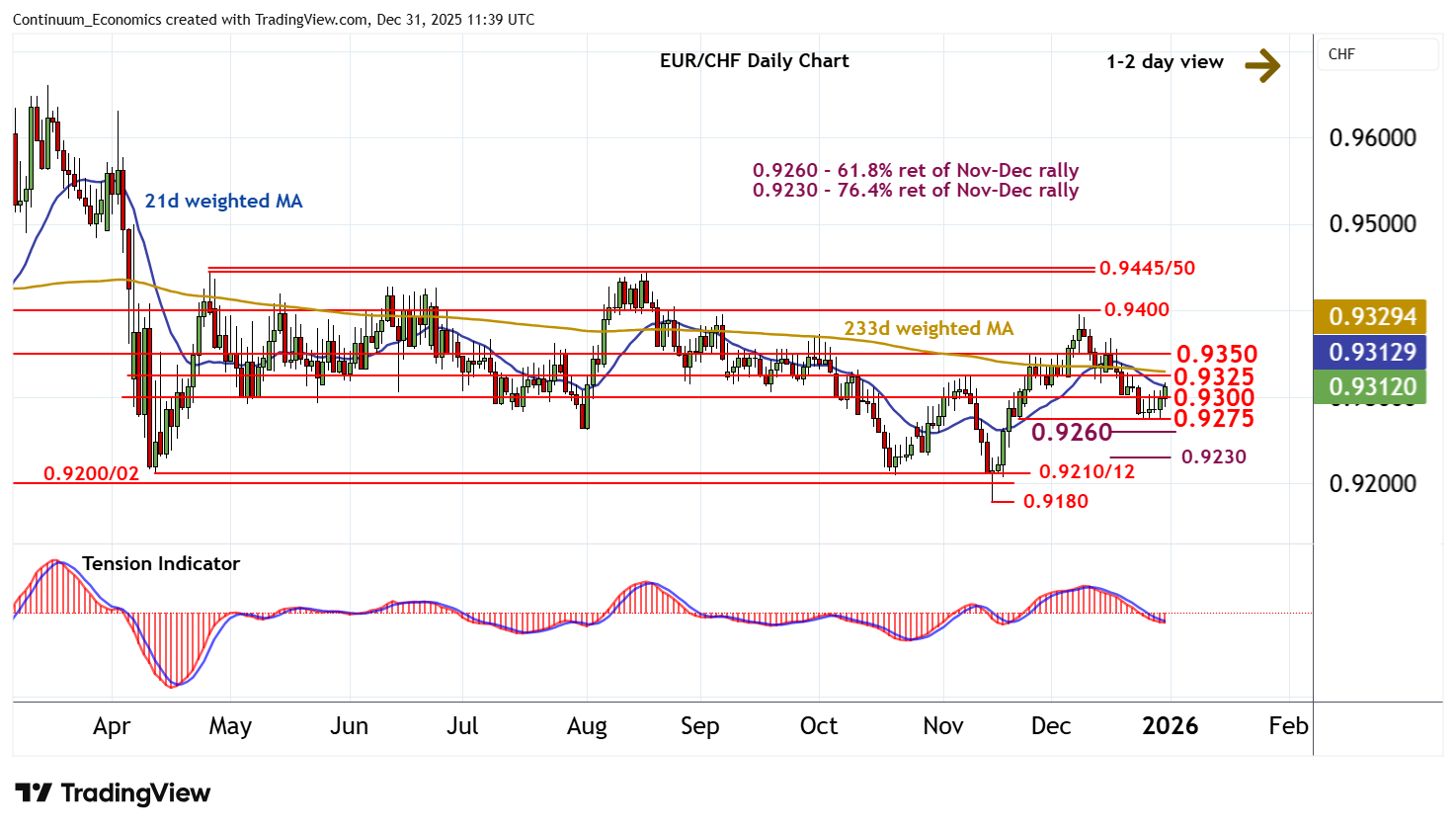 11:20 GMT - Cautious trade has given way to a break above 0.9300, as intraday studies turn higher, with prices currently balanced around 0.9310. Oversold daily stochastics are also edging higher and the bearish daily Tension Indicator is flattening, highlighting room for continuation towards congestion resistance at 0.9325. Broader weekly charts, however, remain under pressure, suggesting any extension beyond here should meet renewed selling interest beneath further congestion around 0.9350. Meanwhile, support is raised to congestion around 0.9300 and extends to the 0.9275 congestion lows. A close beneath here will add weight to sentiment and extend December losses initially to the 0.9260 Fibonacci retracement. Beneath here is the 0.9230 retracement.