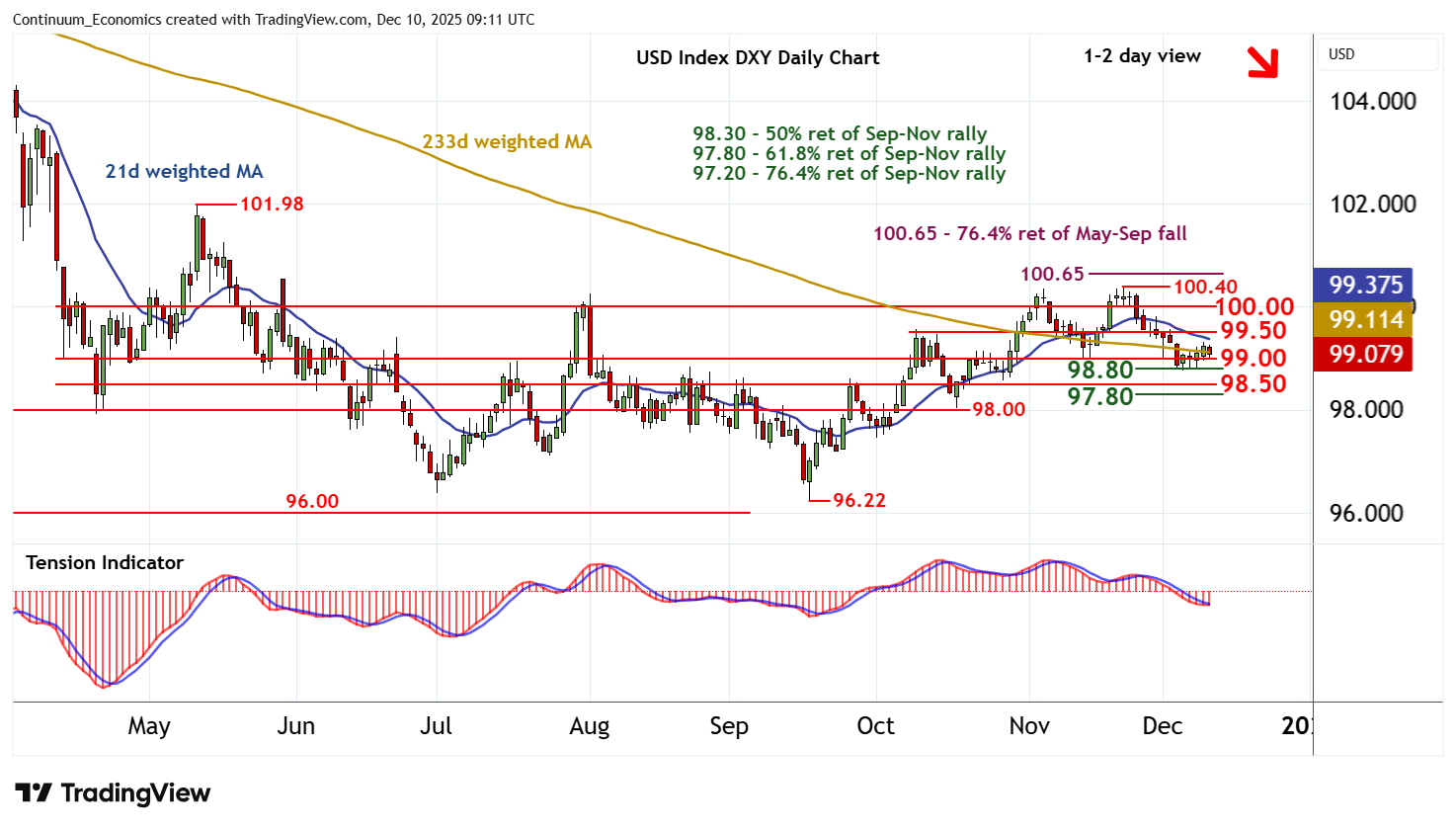 | R3 | 100.40 | ** | 21 Nov (m) high | S2 | 98.80 | * | 38.2% ret of Sep-Nov rally | |