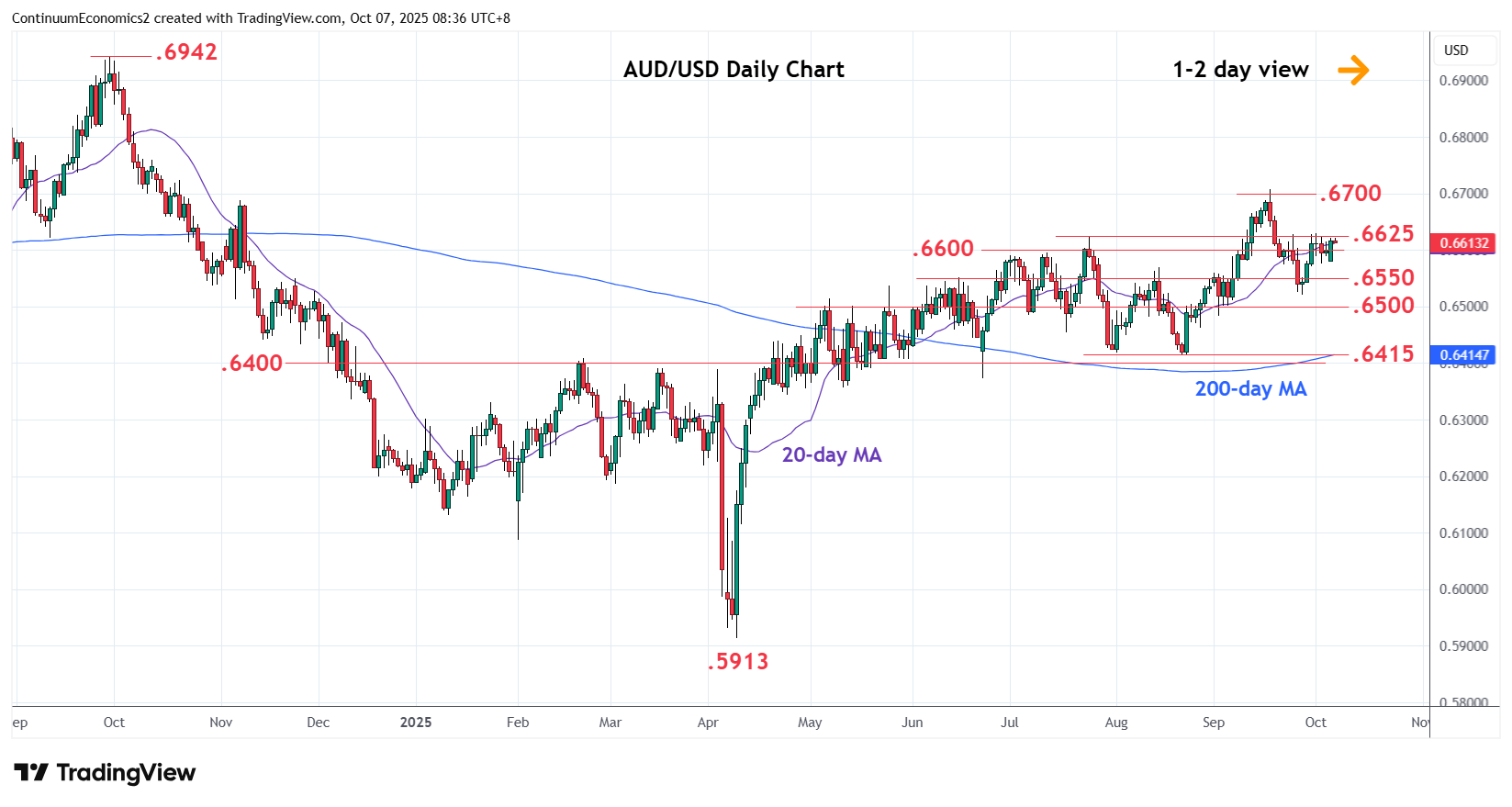Little change, as prices extend consolidation around the .6600 level and below resistance at the .6625 congestion