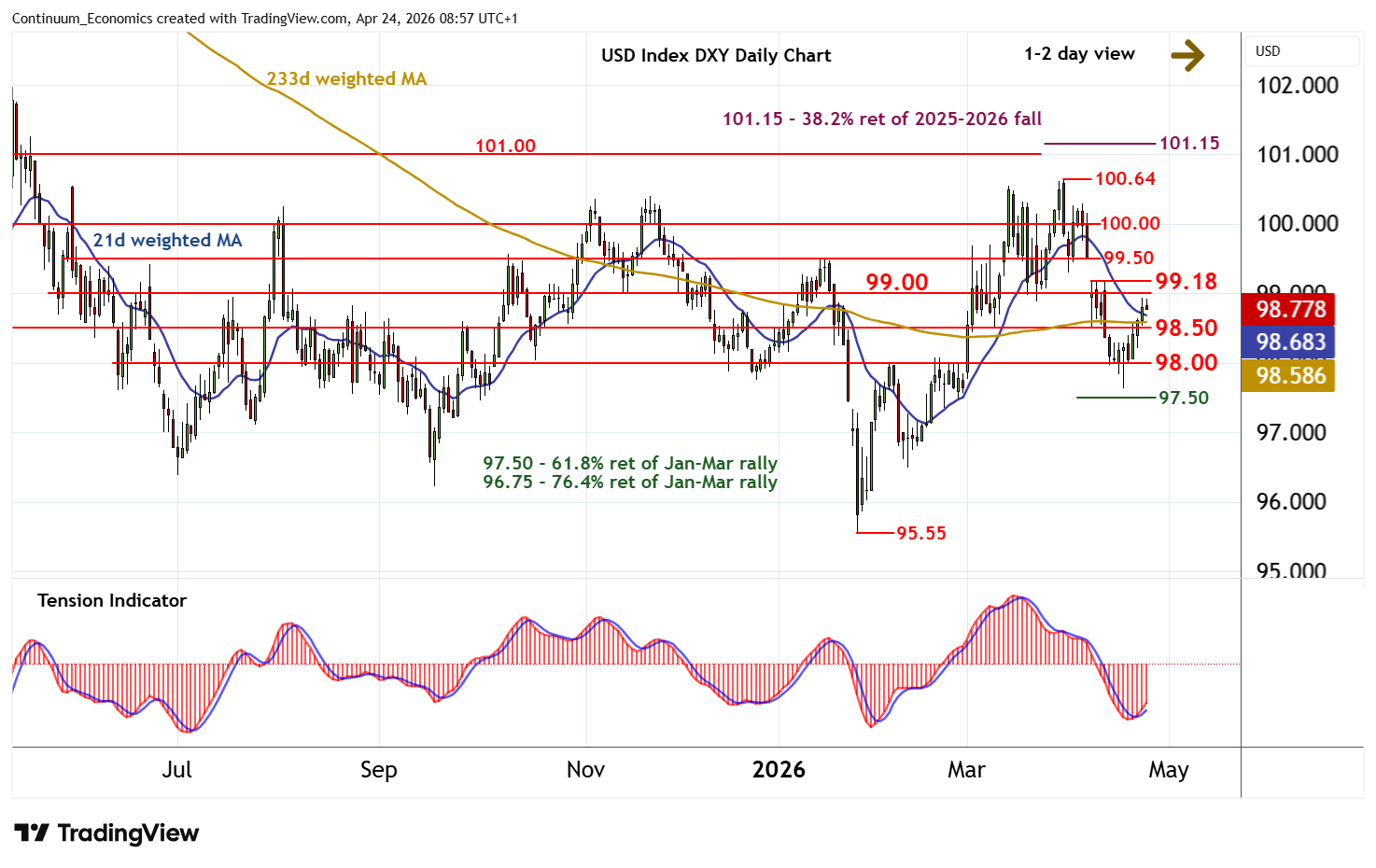 08:50 BST - Anticipated gains have reached 98.95~, where deteriorating intraday studies are prompting renewed selling interest. Daily stochastics and the daily Tension Indicator continue to rise, however, highlighting potential for continuation towards strong resistance at congestion around 99.00 and the 99.18 high of 18 April. But negative weekly charts should limit any immediate tests of this range in renewed selling interest/consolidation. Meanwhile, support remains at congestion around 98.50. A close beneath here will turn sentiment neutral and prompt fresh consolidation above further congestion support at 98.00.