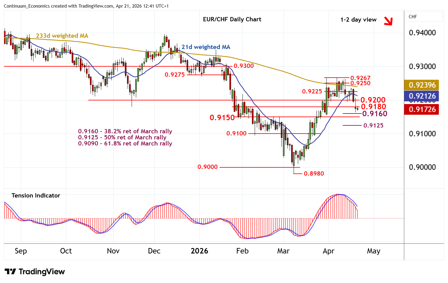 12:05 BST - Little change, as prices extend cautious trade within the narrow 0.9160 - 0.9180 range. Daily readings continue to track lower and overbought weekly stochastics are unwinding, highlighting room for further losses in the coming sessions. A close below the 0.9160 Fibonacci retracement will add weight to sentiment and extend late-March losses below 0.9150 towards the 0.9125 retracement. Meanwhile, resistance is at congestion around 0.9180. But a close above 0.9200 is needed to help stabilise price action and prompt consolidation beneath 0.9225.